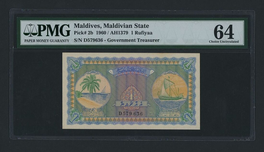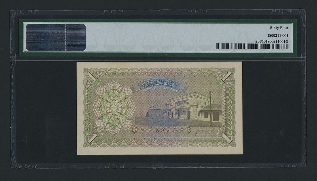 (x) Maldivian State, Maldives, 1 Rufiyaa, 1960, serial number D579636, (Pick 2b, BNB 102), in PMG holder 64 Choice Uncirculated