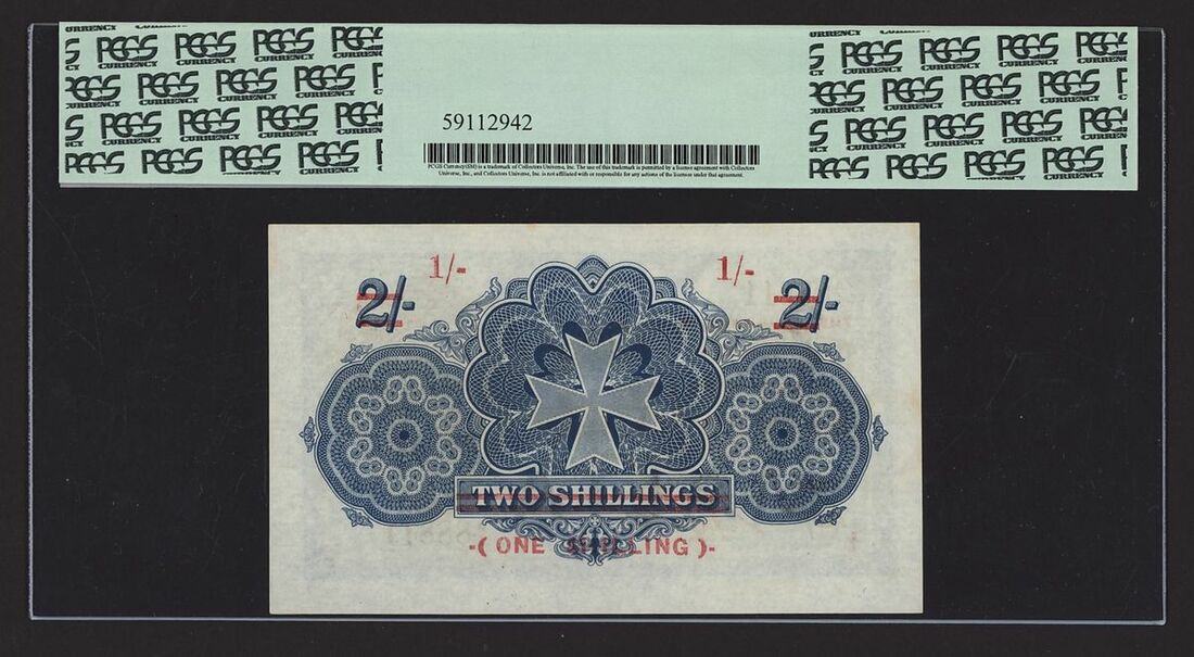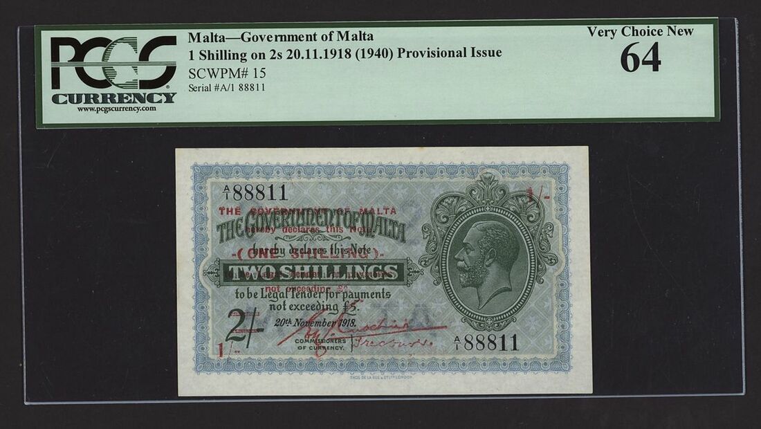 (x) Government of Malta, 1 Shilling overprint on 2 Shillings, 20th November 1918 (1940), serial number A/1 88811, provisional issue