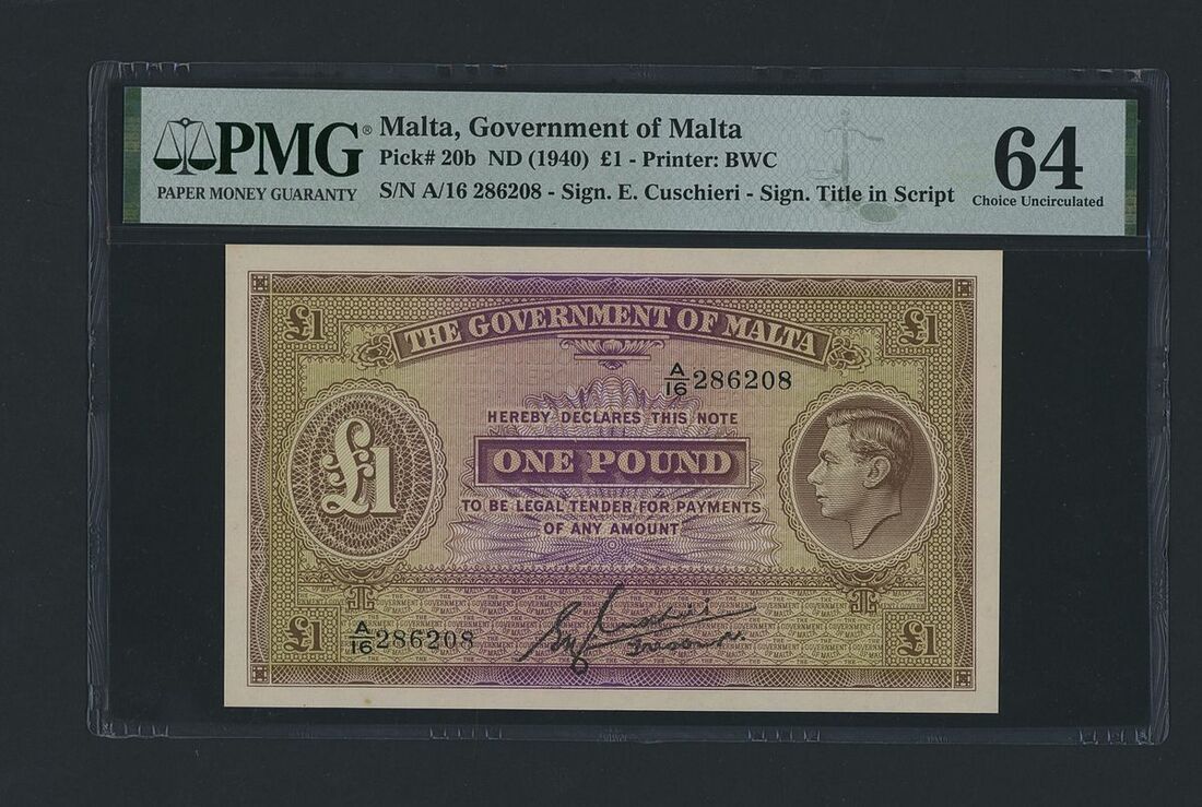 Government of Malta £1, ND (1940), serial number A/16 286208, (Pick 20b, BNB 119), in PMG holder 64 Choice Uncirculated