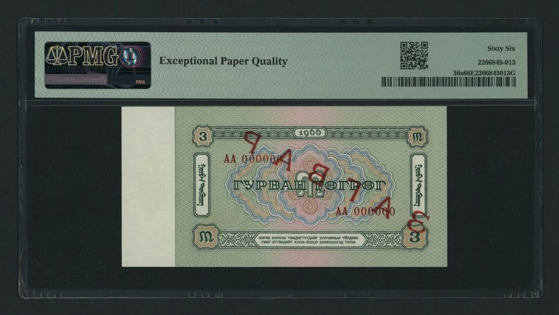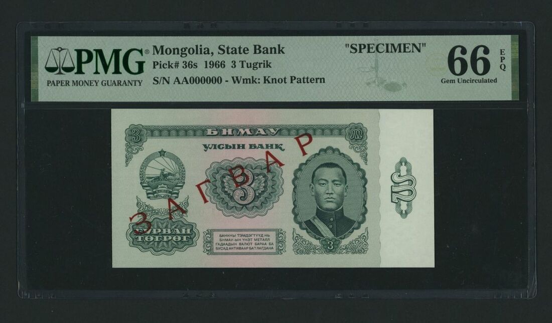 State Bank, Mongolian People's Republic, specimen 3 Tugrik, 1966, serial number AA000000, (Pick 36s, BNB 309as), in PMG holder 66 EPQ Gem Uncirculated