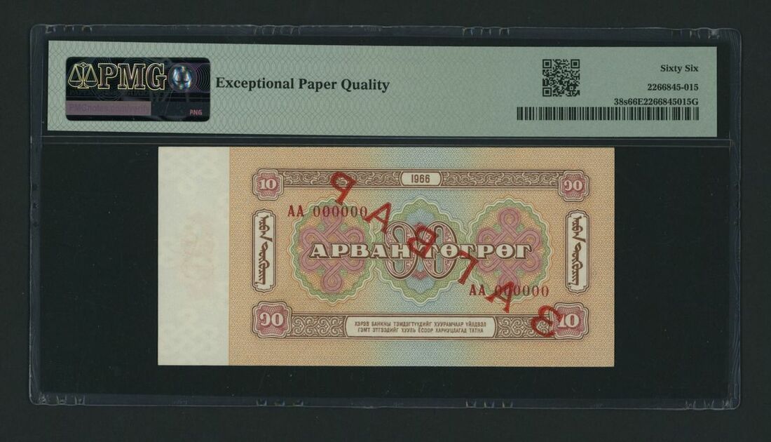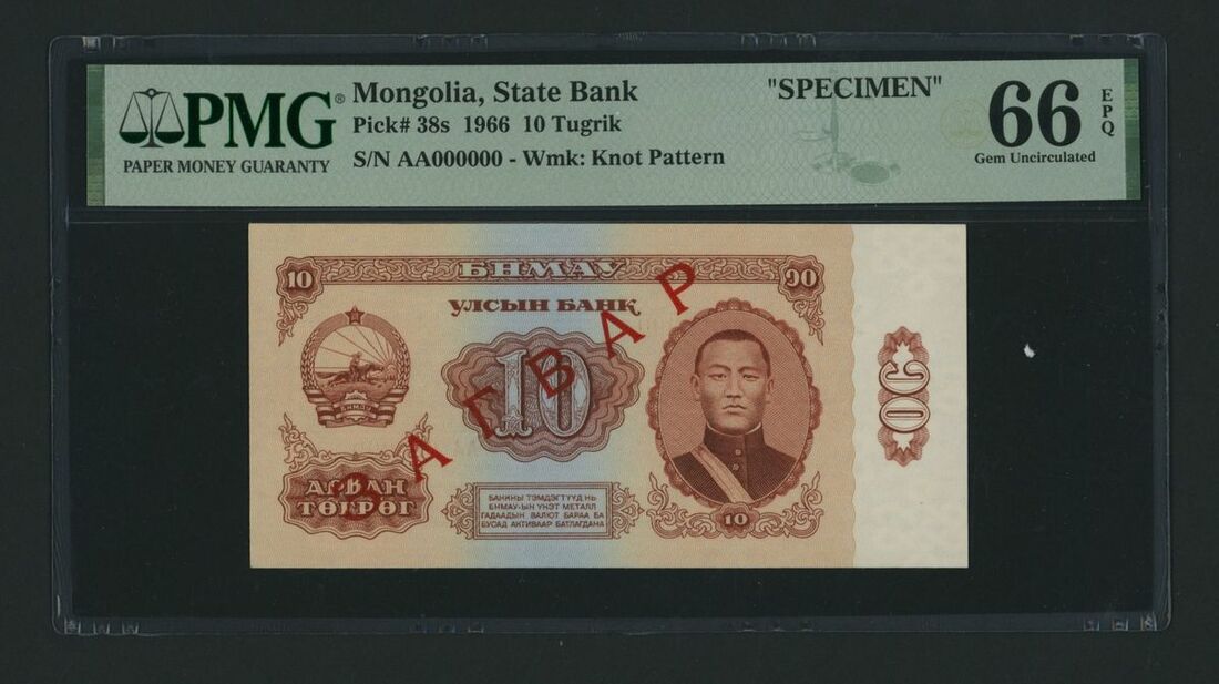 State Bank, Mongolian People's Republic, [Top Pop] specimen 10 Tugrik, 1966, serial number AA000000, (Pick 38s, BNB 311as), in PMG holder 66 EPQ Gem Uncirculated