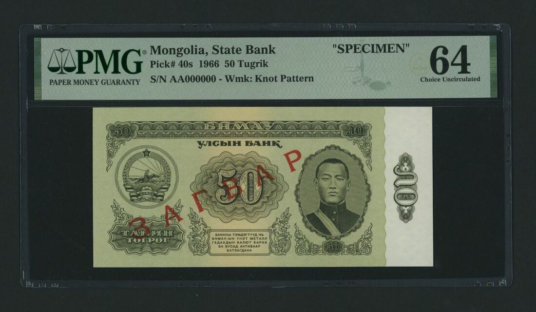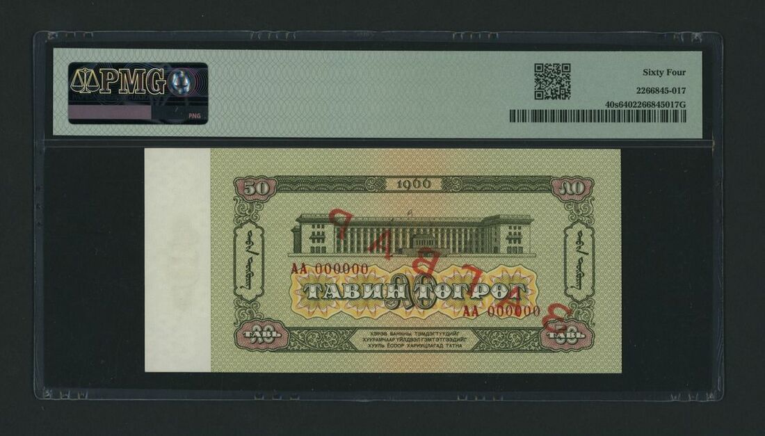 State Bank, Mongolian People's Republic, specimen 50 Tugrik, 1966, serial number AA000000, (Pick 40s, BNB 314as), in PMG holder 64 Choice Uncirculated