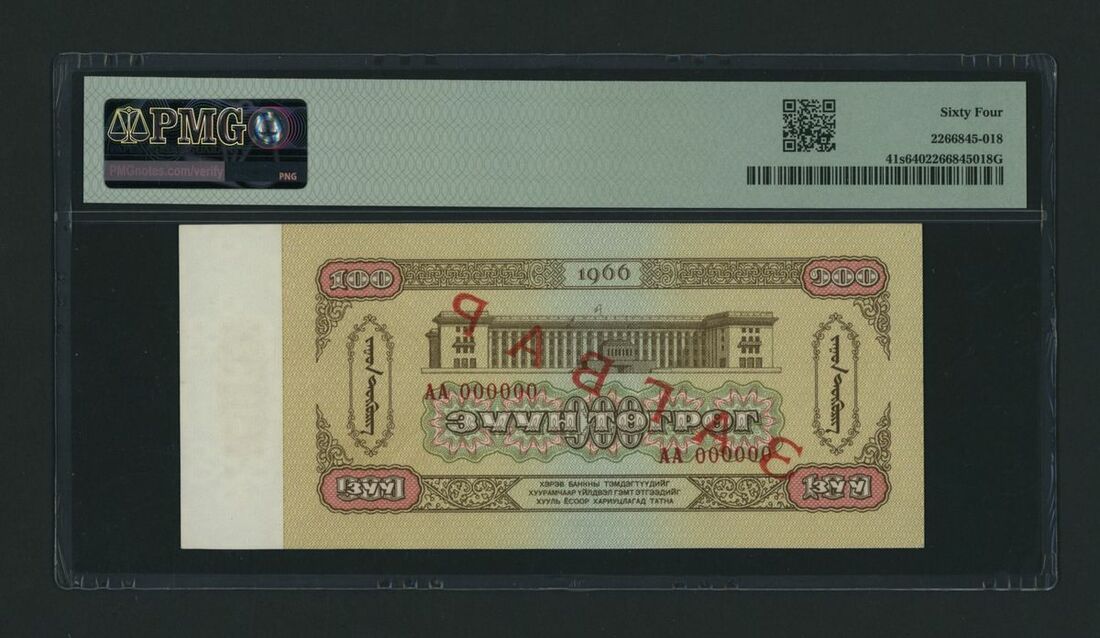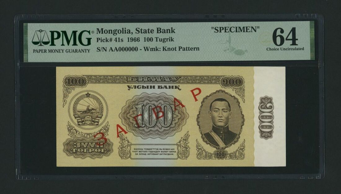 State Bank, Mongolian People's Republic, specimen 100 Tugrik, 1966, serial number AA000000, (Pick 41s, BNB 315as), in PMG holder 64 Choice Uncirculated