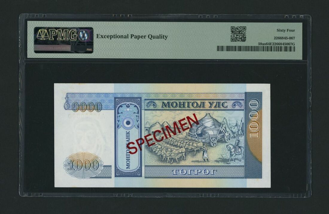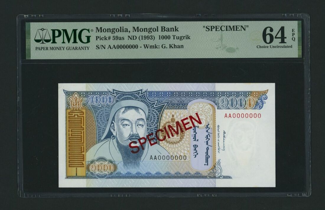 Mongolbank, specimen 1000 Tugrik, ND (1993), serial number AA0000000, (Pick 59as, BNB 411as1), in PMG holder 64 EPQ Choice Uncirculated