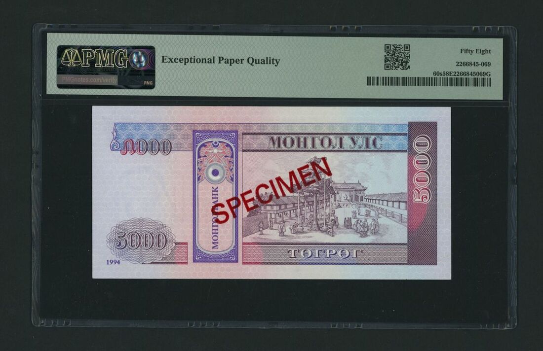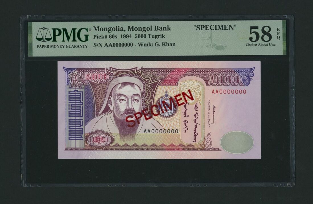 Mongolbank, specimen 5000 Tugrik, 1994, serial number AA0000000, (Pick 60as, BNB 415as), in PMG holder 58 EPQ Choice About Uncirculated