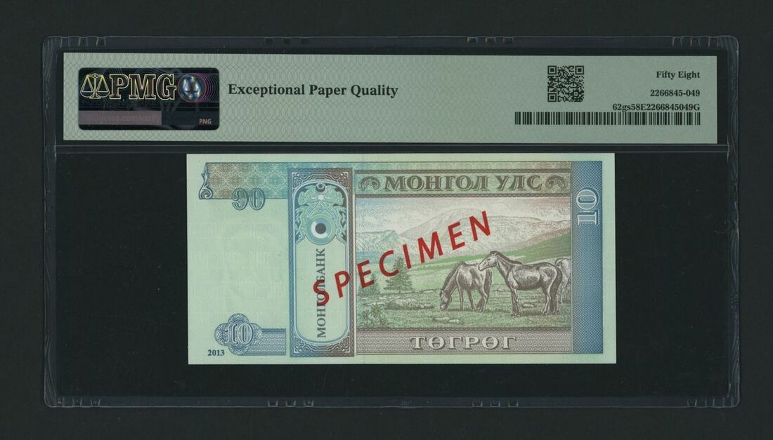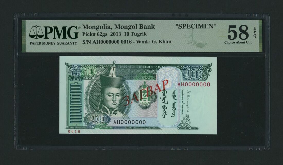 Mongolbank, [Top Pop] specimen 10 Tugrik, 2013, serial number AH0000000, specimen number 0016, (Pick 62gs, BNB 430cs), in PMG holder 58 EPQ Choice About Uncirculated