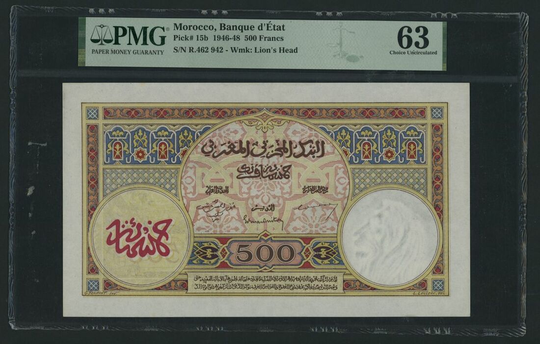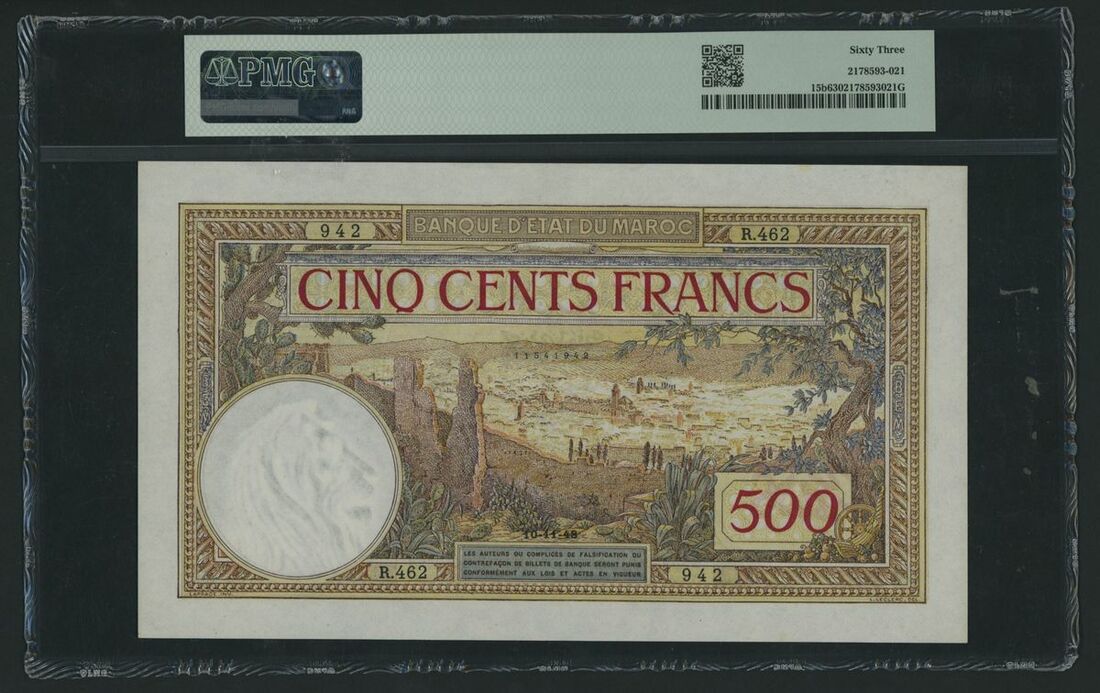 (x) Banque d´Etat du Maroc, Morocco, 500 Francs, 10th November 1948, serial number R.462 942, (Pick 15b, BNB 215), in PMG holder 63 Choice Uncirculated