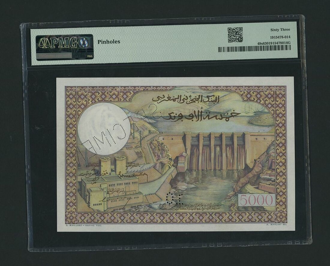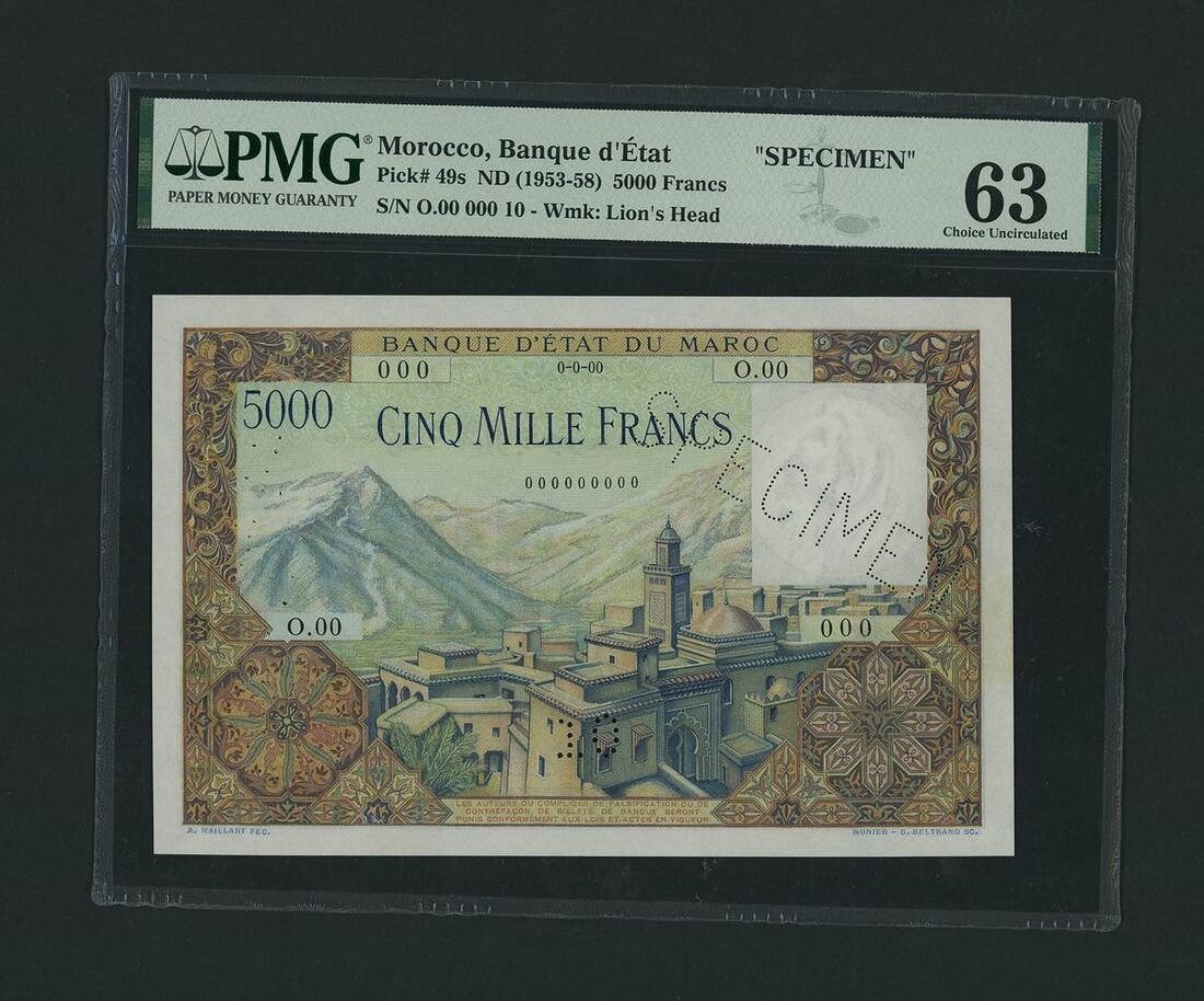 (x) Banque d´État du Maroc, Morocco, specimen 5000 Francs, ND (1953-58), serial number O.00 000 10, (Pick 49s, BNB 231), in PMG holder 63 Choice Uncirculated, pinholes