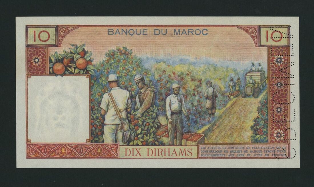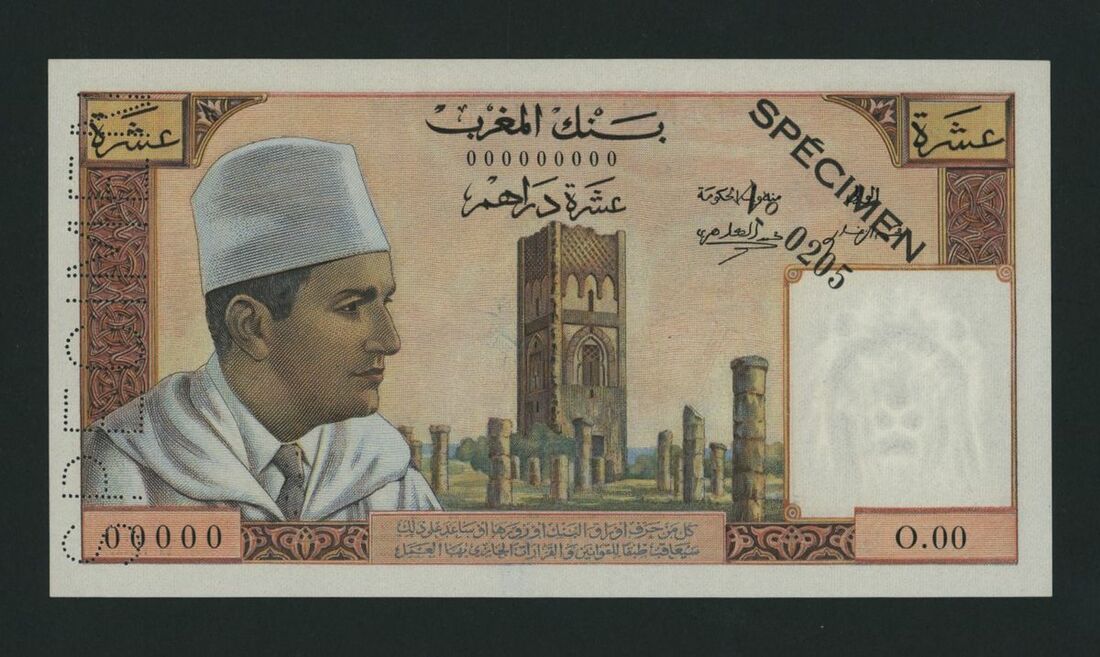 (x) Banque du Maroc, Morocco, specimen 10 Dirhams, ND (1960), serial number 00000000 0205, (Pick 54s, BNB 402as), uncirculated, cancelled perforation