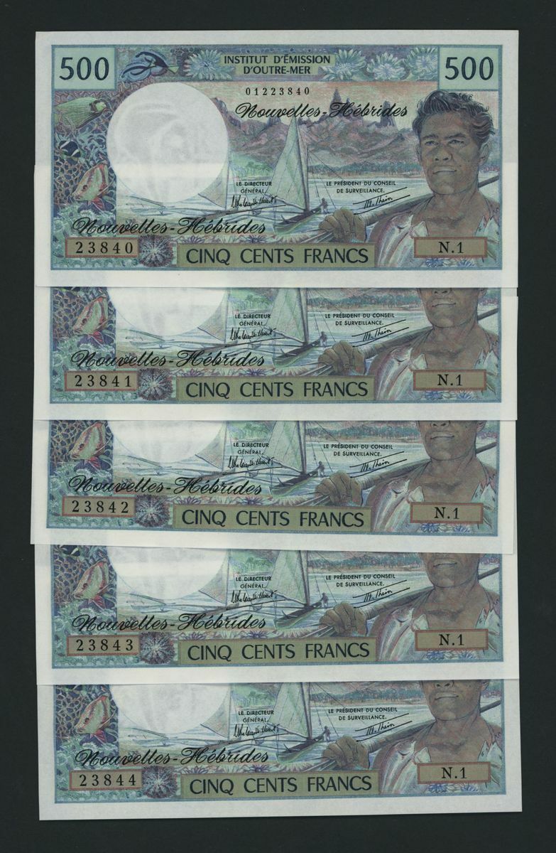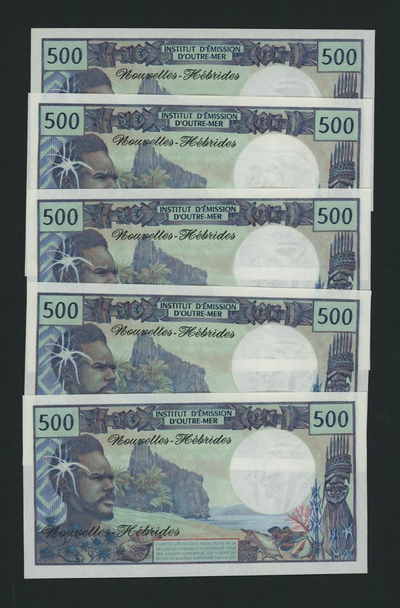 Institut d'Emission d'Outre-Mer, New Hebrides, [5 notes] 500 Francs, ND (1970), consecutive serial number 01223840-4, (Pick 19c, BNB 404c), about uncirculated, counting creases (5 notes)