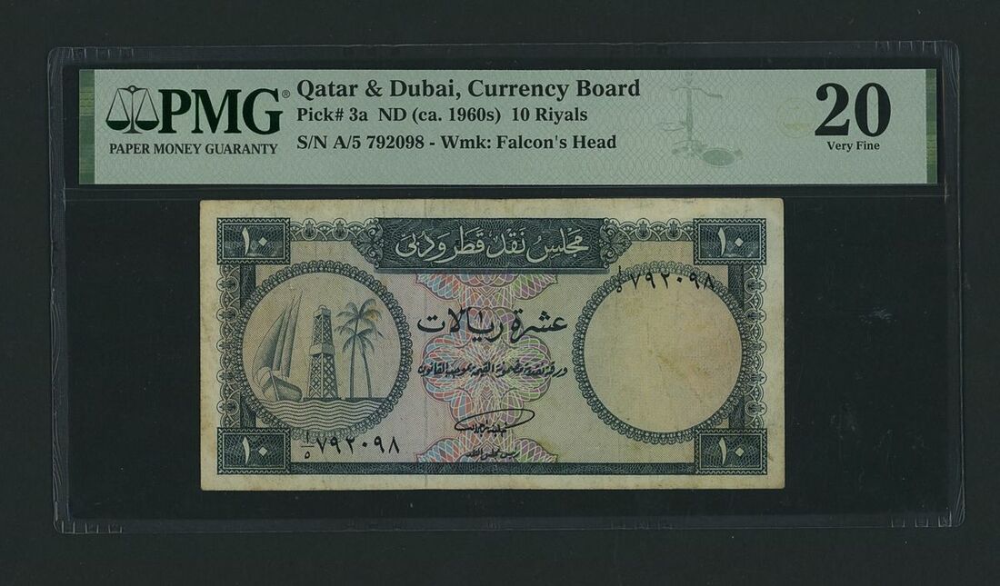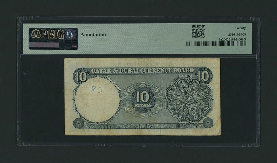 (x) Qatar & Dubai Currency Board, 10 Riyals, ND (ca. 1960s), serial number A/5 792098, (Pick 3a, BNB 103), in PMG holder 20 Very Fine, annotation