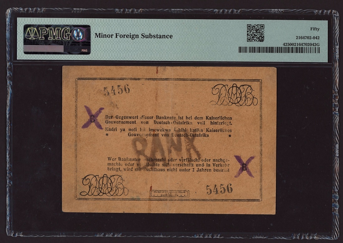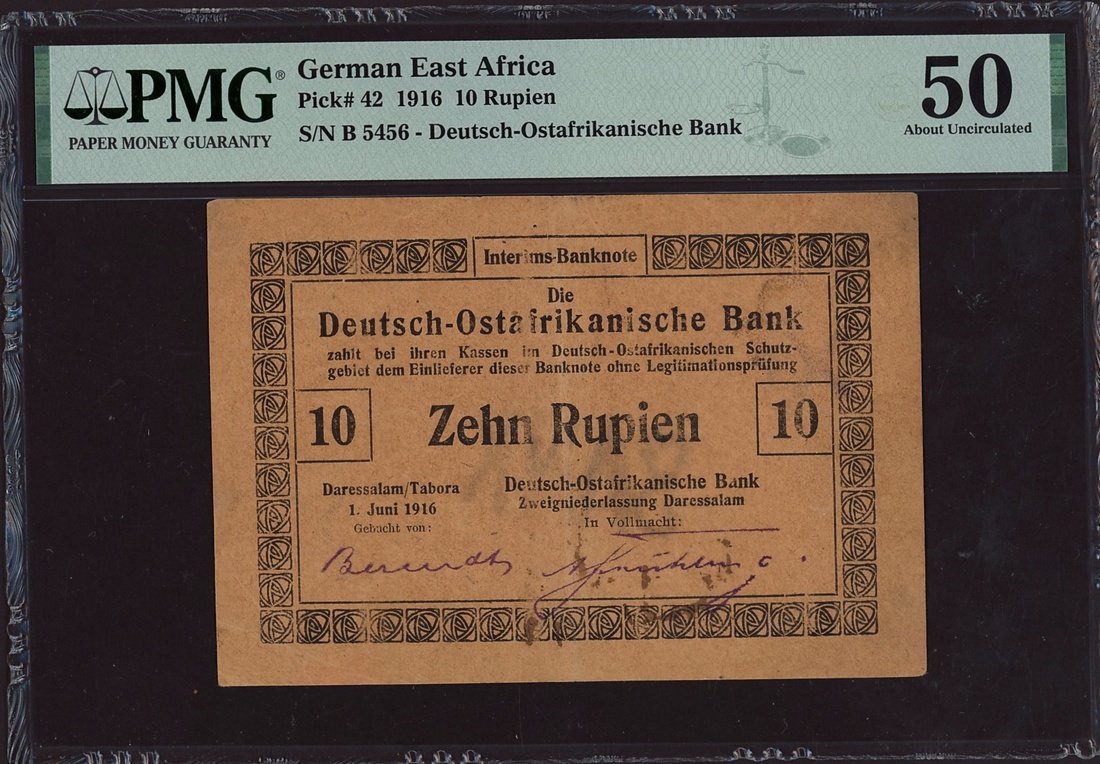 Deutsch-Ostafrikanische Bank, German East Africa, 10 Rupien, 1916, serial number B 5456, (Pick 42), in PMG holder 50 About Uncirculated, minor foreign substance