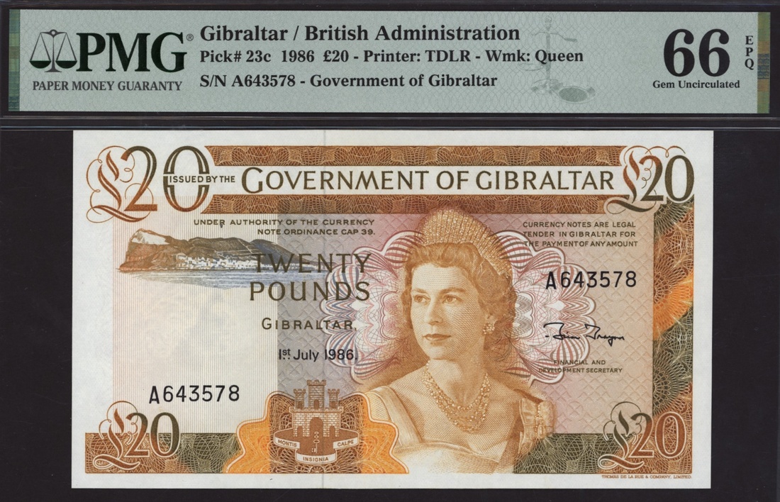 (x) Government of Gibraltar, £20, 1st July 1986, serial number A643578, (Pick 23c), in PMG holder 66 EPQ Gem Uncirculated