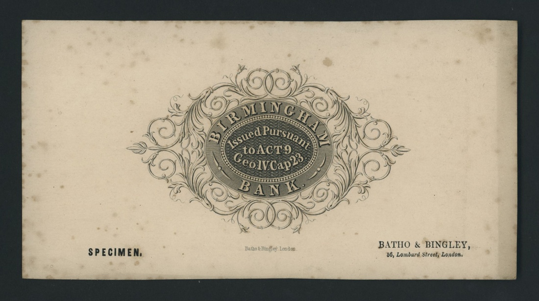 Birmingham Bank, reverse specimen, Batho & Bingley, London, black and white, for Attwoods, Spooner & Co.
