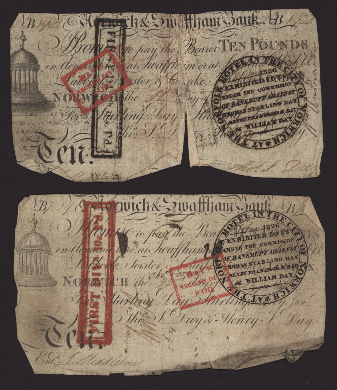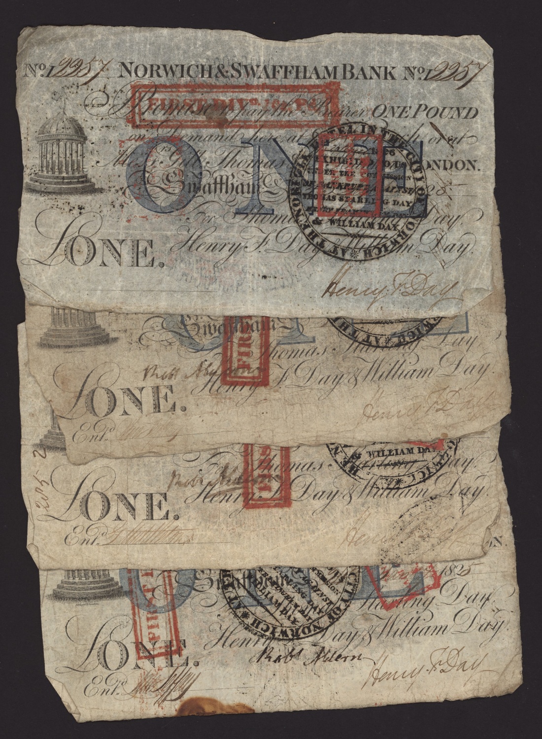 Norwich and Swaffham Bank, [8 notes] £1, £5, £10, circa 1825, (Outing 1609i, 1609i, 1609i, 1609i, 1609k, 1609k, 1609l, 1609l), poor to very good, many pinholes and significant rips on one £5 and one £10 note (8 notes)