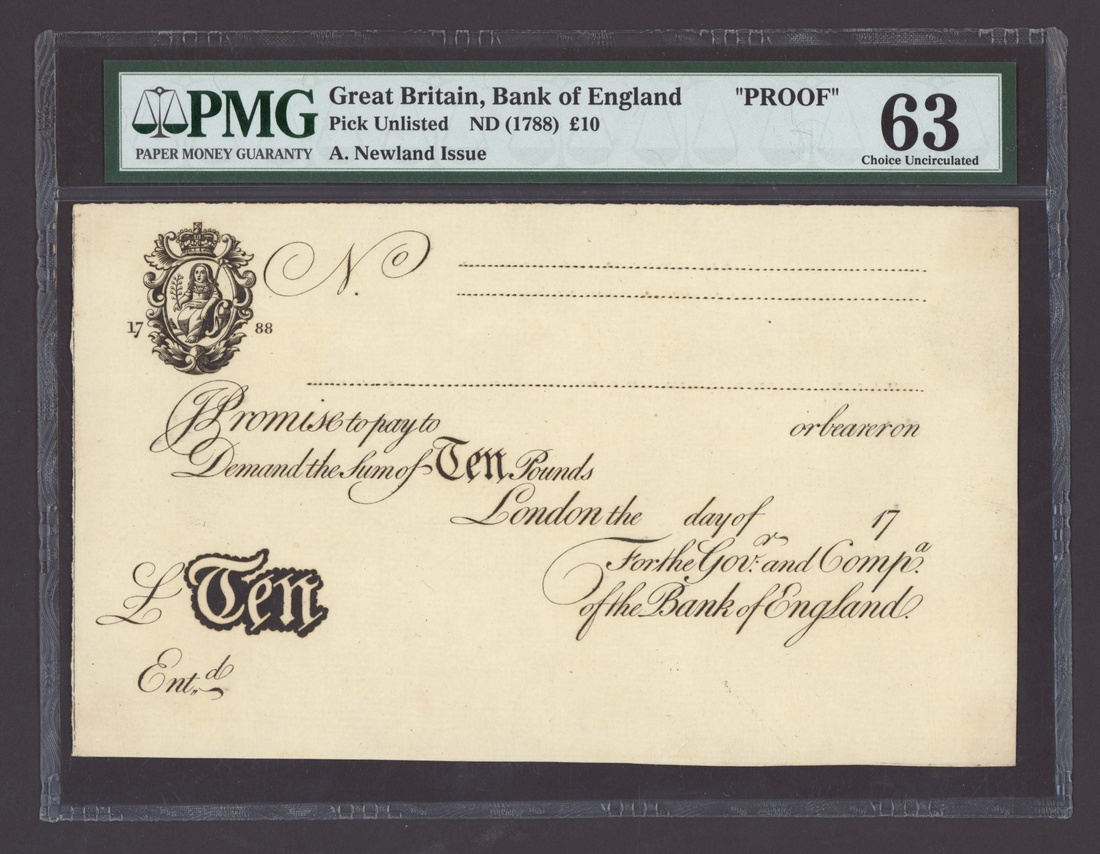Bank of England, proof on card, £10, 17- (1788), Newland signature, black and white, Britannia in ornate crowned vignette top left, date 1788 at left and right of vignette, value in black tablet low left