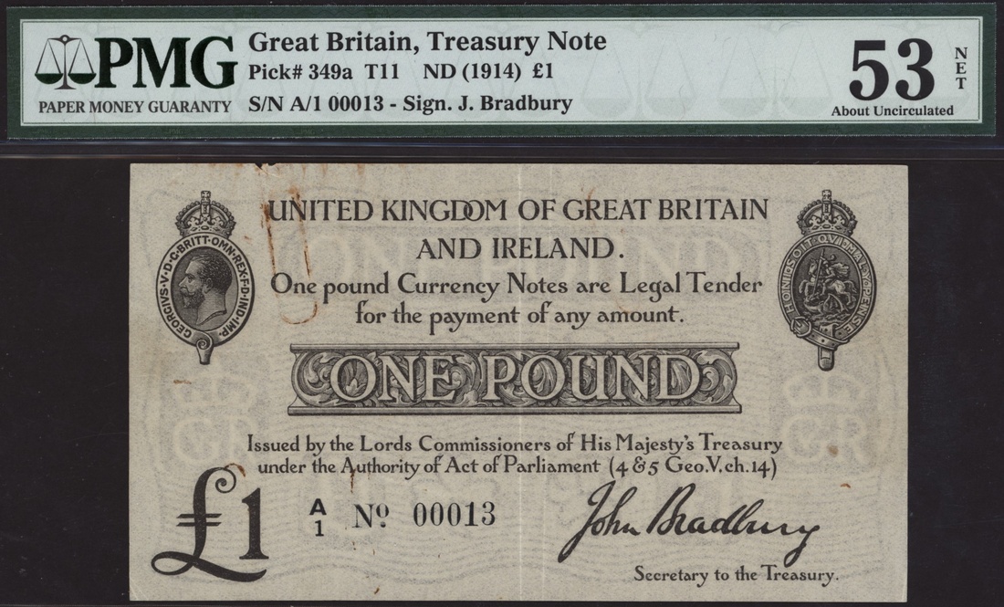 Treasury, £1, ND (1914), serial number A/1 00013, Bradbury signature, (Pick 349a, BNB 504, T11), in PMG holder 53 NET About Uncirculated, rust, formerly in Lou Manzi's collection, very low serial number 13