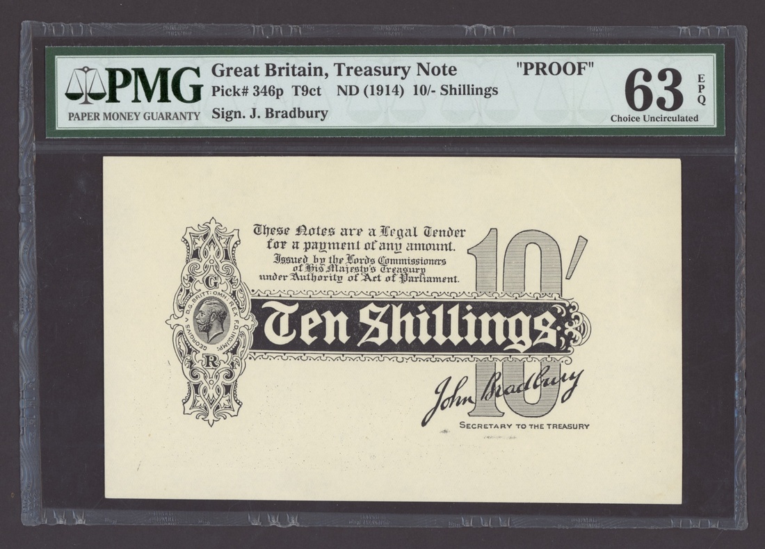 Treasury Series, John Bradbury, proof 10 Shillings, ND (1914), (T9ct), in PMG holder 63 EPQ Choice Uncirculated