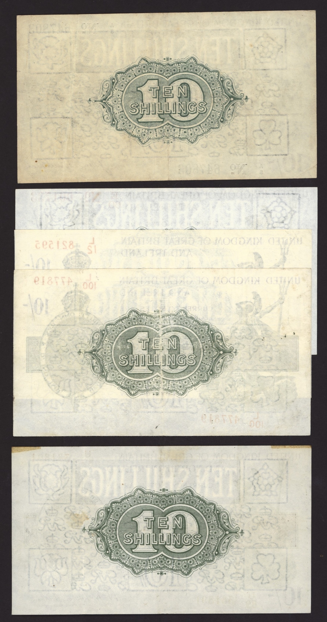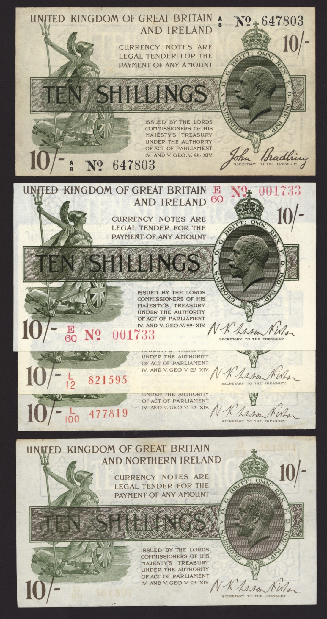 Treasury, Great Britain, [5 notes] 10 Shillings, 1918-28, Bradbury and Fisher signatures, Bradbury signature (1): ND (1918), serial number A/8 647803; Fisher signature (4): ND (1919), serial number E/60 001733, ND (1922-3), serial numbers L/12 821595 and L/100 477819; ND (1928), serial number U/89 381891