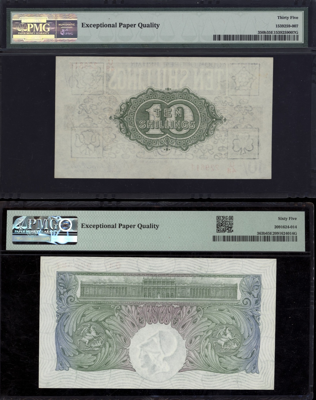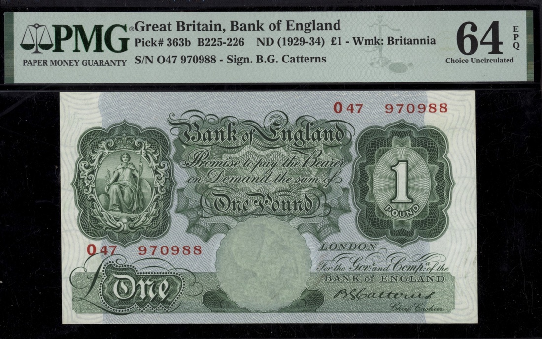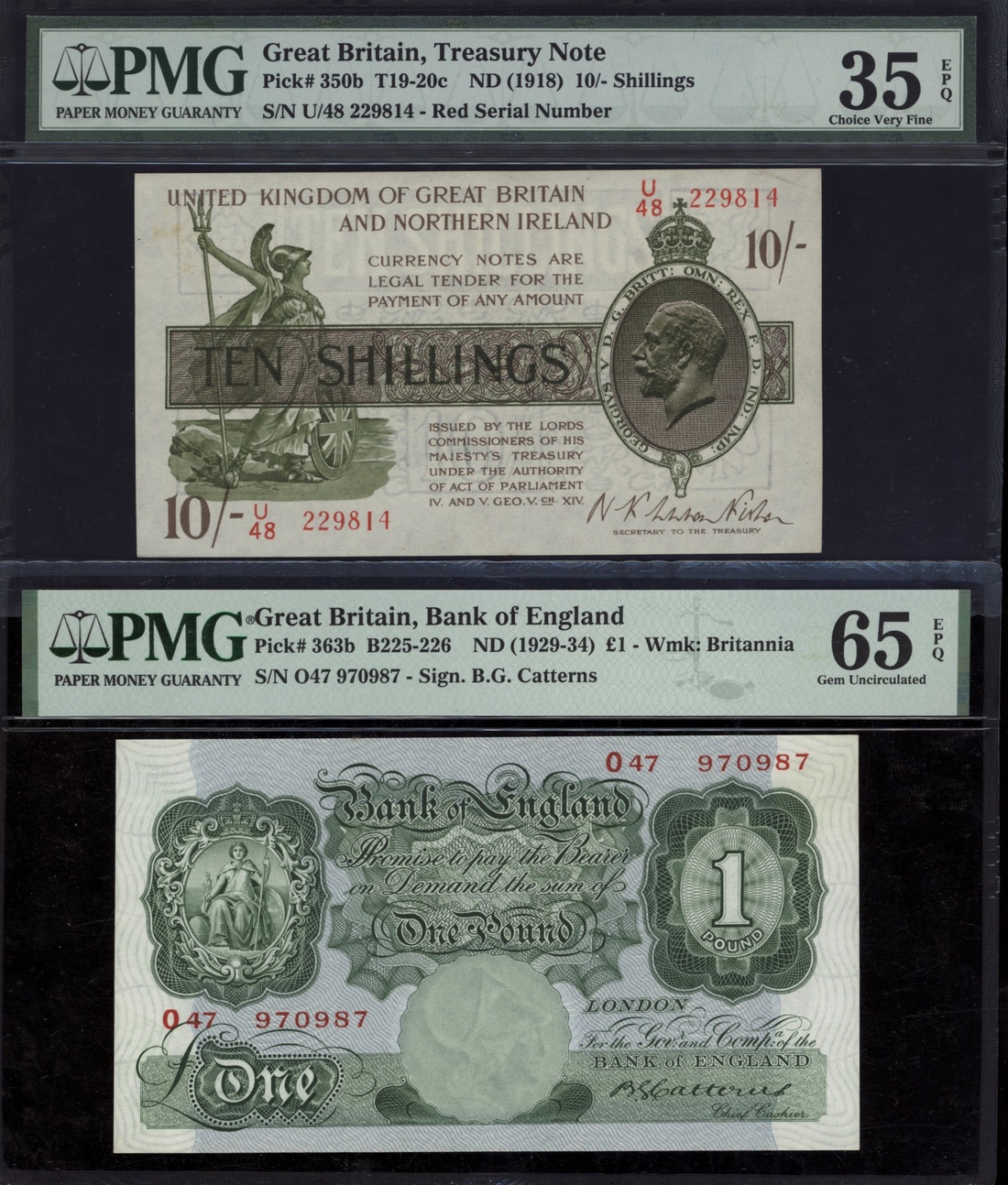 (x) Bank of England, [3 notes] 10 Shillings, £1, 1927-1930, Fisher and Catterns signatures, 10/-, ND (1927), serial number U/48 229814, wording on note reads 'United Kingdom of Great Britain and Northern Ireland', the change to 'Northern Ireland' as opposed to 'Ireland' following the Royal Parliamentary Titles Act of 1927; £1 (2), ND (1930), consecutive serial numbers O47 970987-8