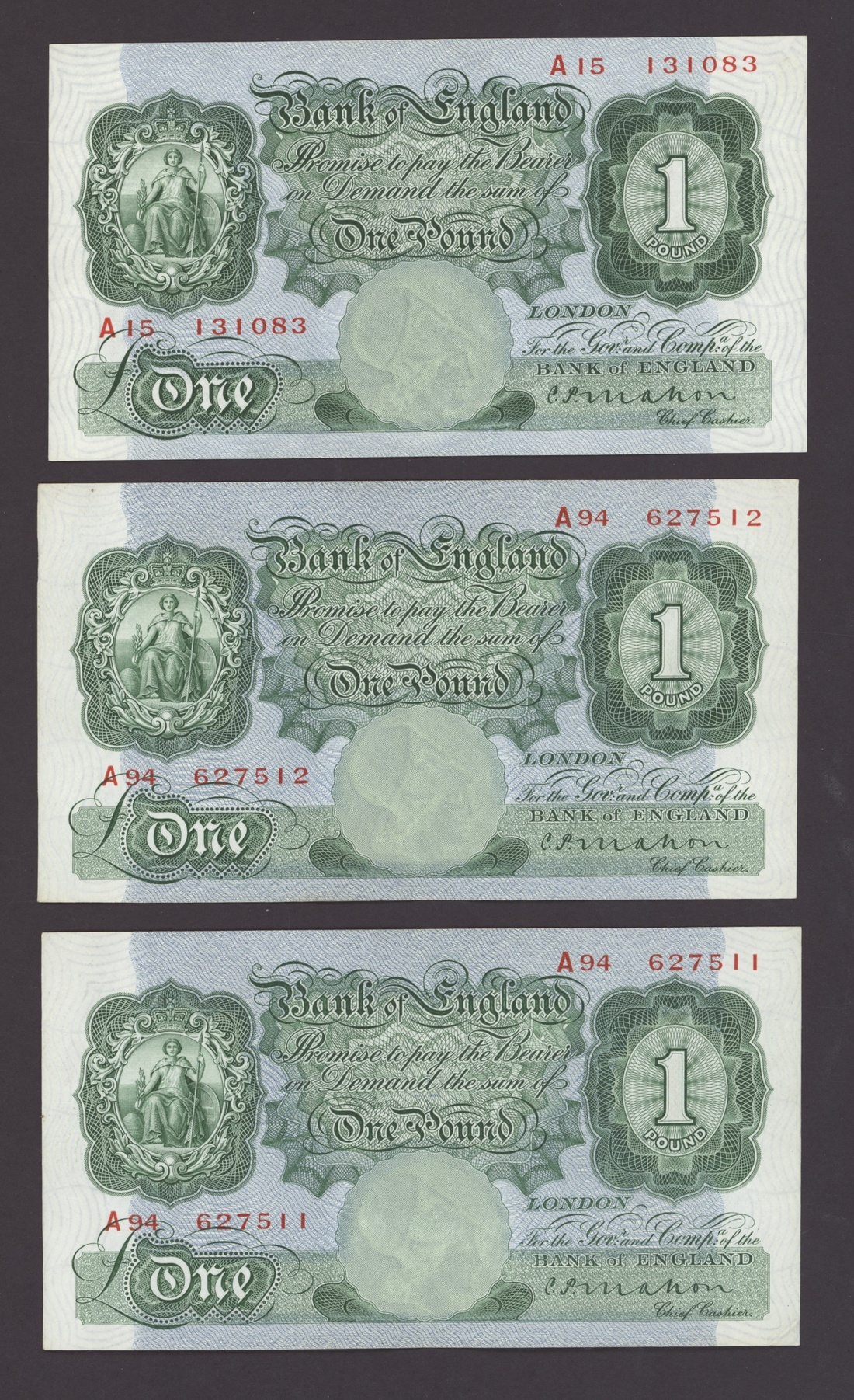 Bank of England, [3 notes] £1, 22nd November 1928, serial number A15 131083, A94 627511-12, C.P. Mahon signature, (EPM B212), about extremely fine to extremely fine (3 notes)