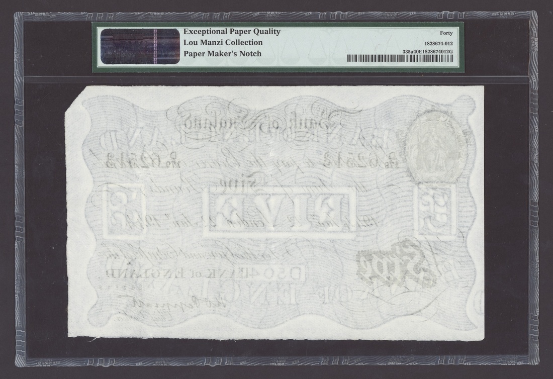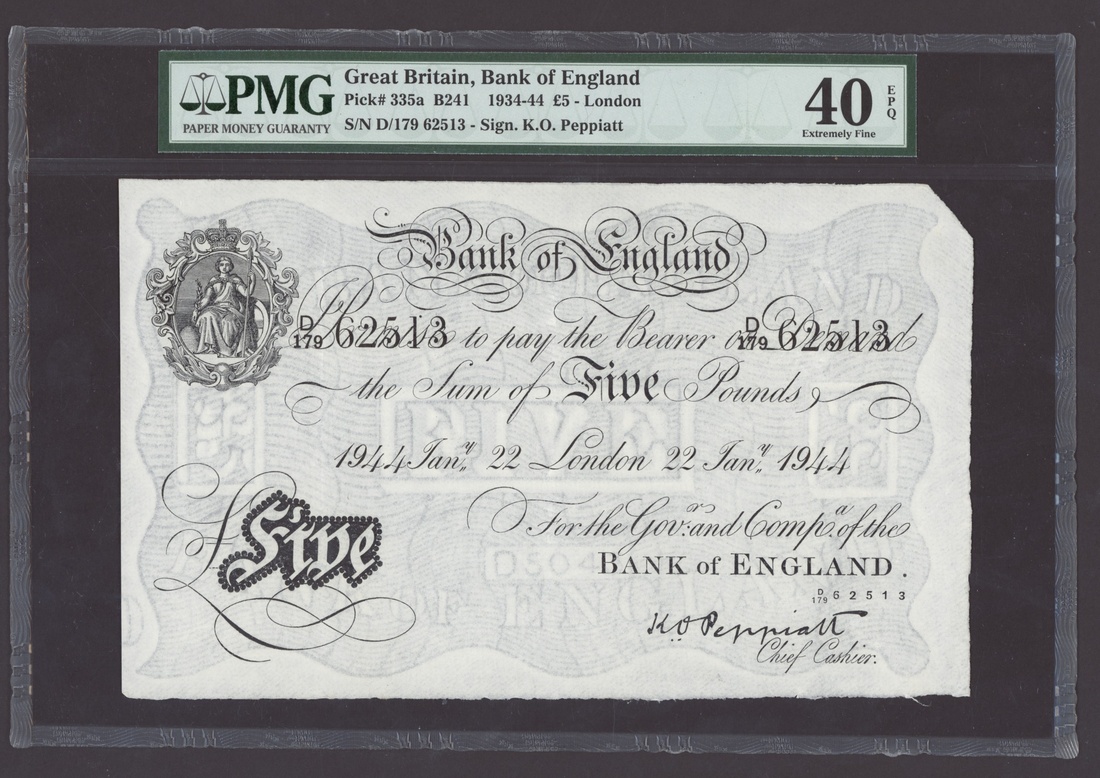 Bank of England, £5, London, 22nd January 1944, serial number D/179 62513, K.O. Peppiatt signature, black and white, ornate crowned vignette of Britannia top left, 'I promise to pay to Bearer on demand the sum of Five Pounds' in text at centre, value in black tablet low left, printed serial number, date and signature
