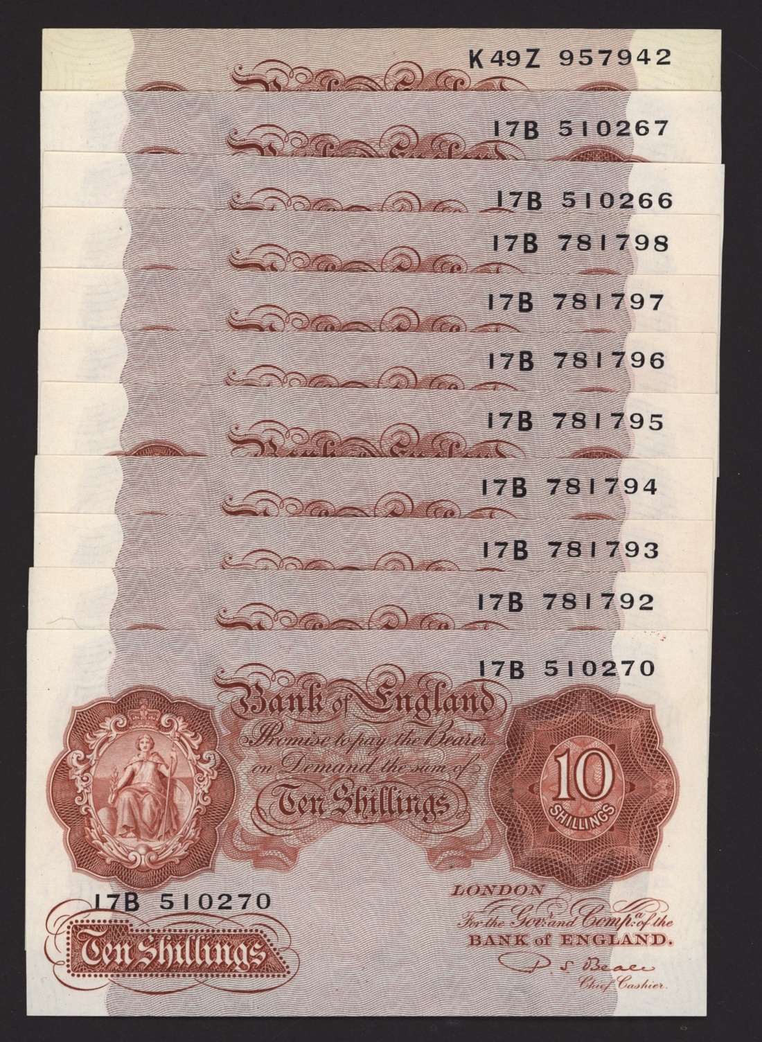 Bank of England, Percival S. Beale, [11 notes] 10 Shillings, P.S. Beale signature, consecutive numbers 17B 781792-98, 17B 510266-77, also including 17B 510270, K49Z 957942