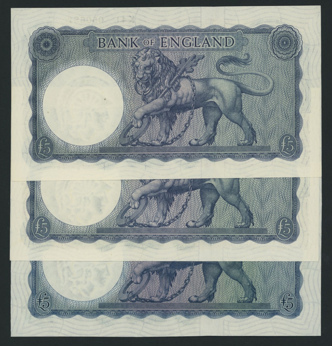 Bank of England, [3 notes] £5, ND (1957-1961), serial numbers A39 545180, H79 727803, K41 050681, L.K. O'Brien signature, (EPM B277, B280), uncirculated (3 notes)
