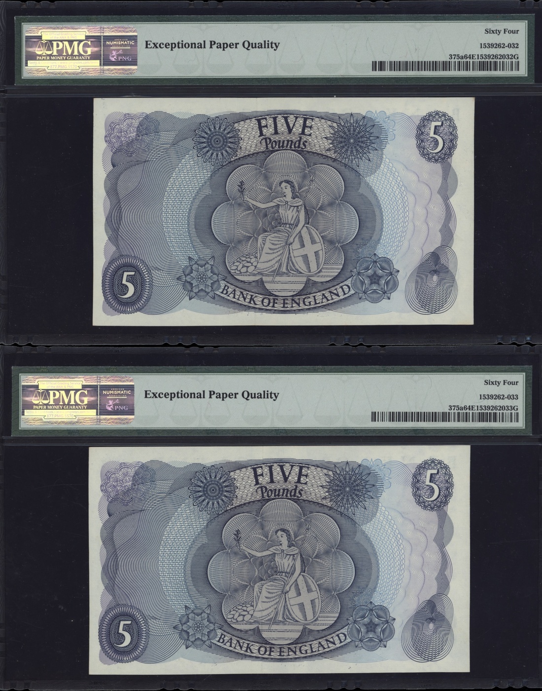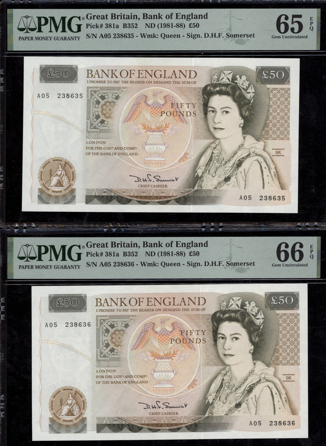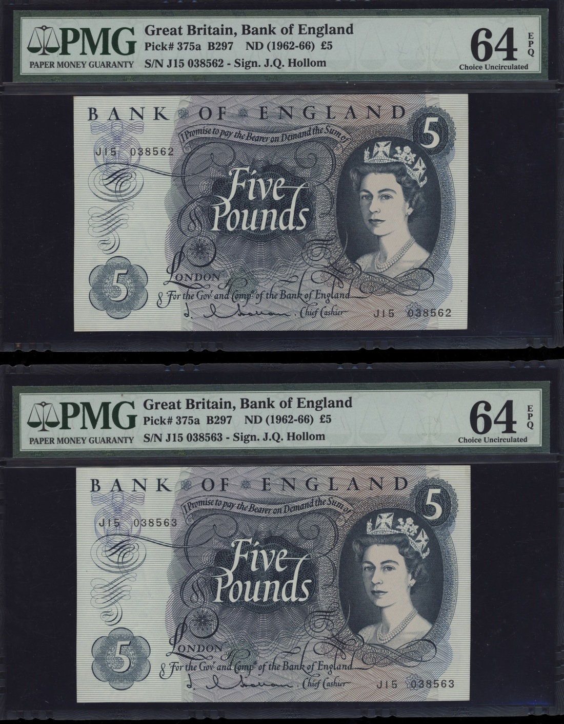 (x) Bank of England, [6 notes] £5, £10, £50, 1963-1981, two pairs of consecutive serial numbers, £5 (2), ND (1963), J. Q. Hollom signature, consecutive serial numbers J15 038562-3; £10 (2), ND (1971), J. B. Page signature, serial numbers B05 001823 and B26 493522; £50 (2), ND (1981), D. H. F. Somerset, consecutive serial numbers A05 238635-6
