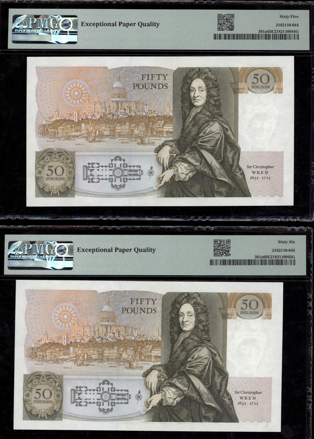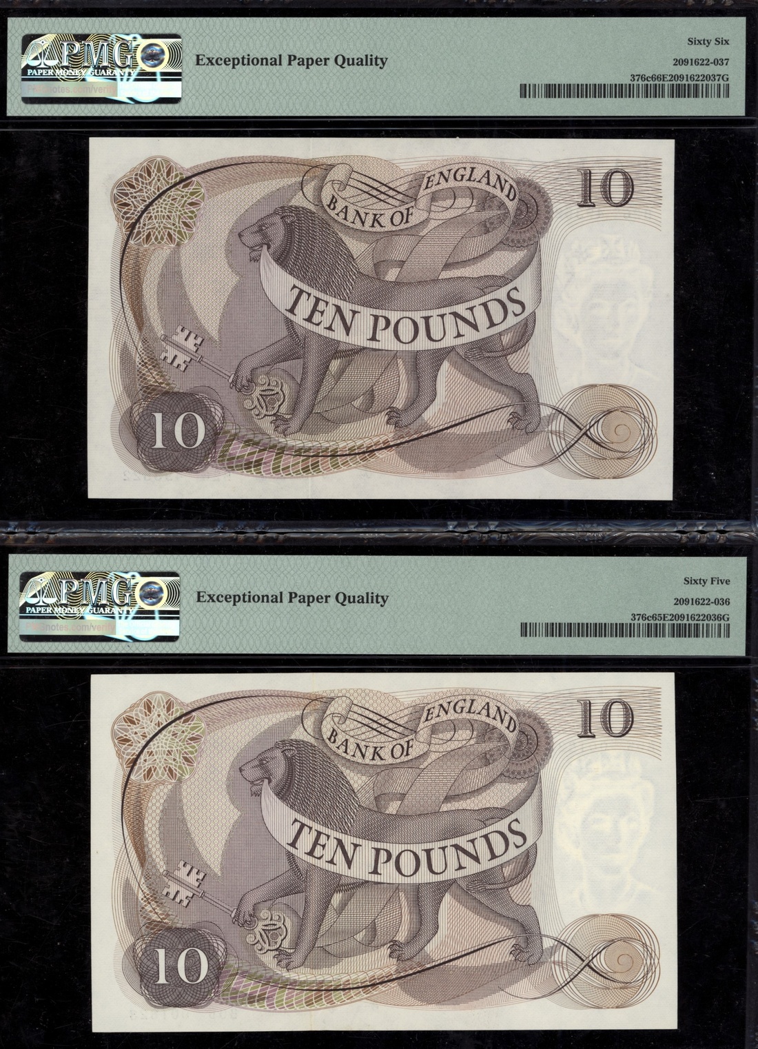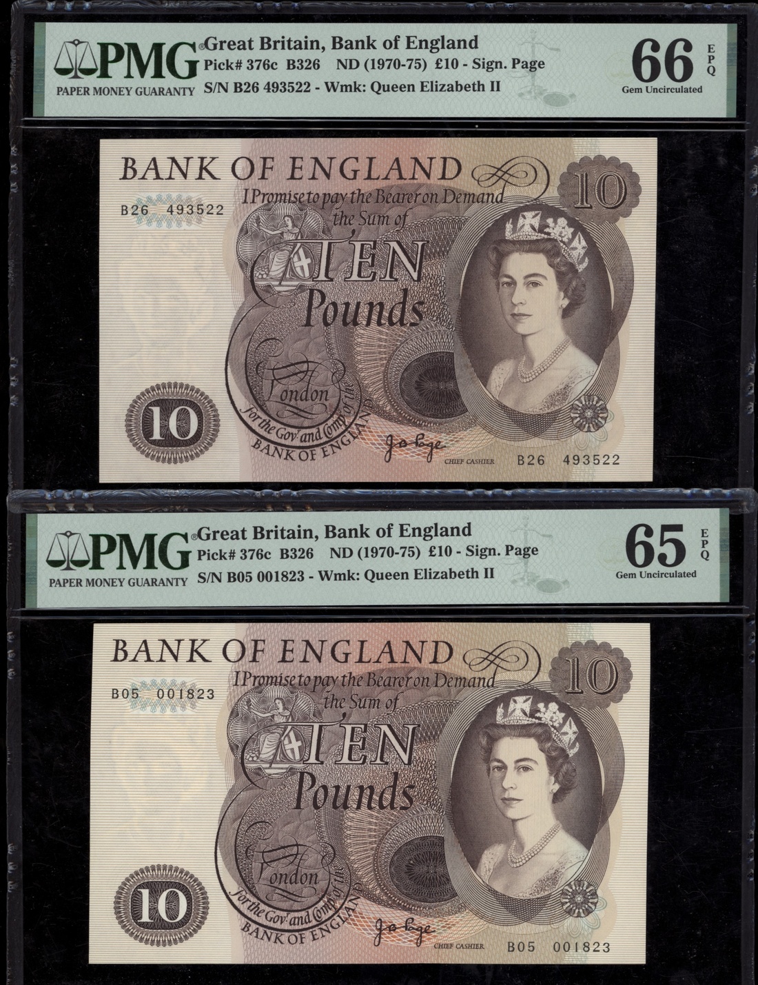 (x) Bank of England, [6 notes] £5, £10, £50, 1963-1981, two pairs of consecutive serial numbers, £5 (2), ND (1963), J. Q. Hollom signature, consecutive serial numbers J15 038562-3; £10 (2), ND (1971), J. B. Page signature, serial numbers B05 001823 and B26 493522; £50 (2), ND (1981), D. H. F. Somerset, consecutive serial numbers A05 238635-6