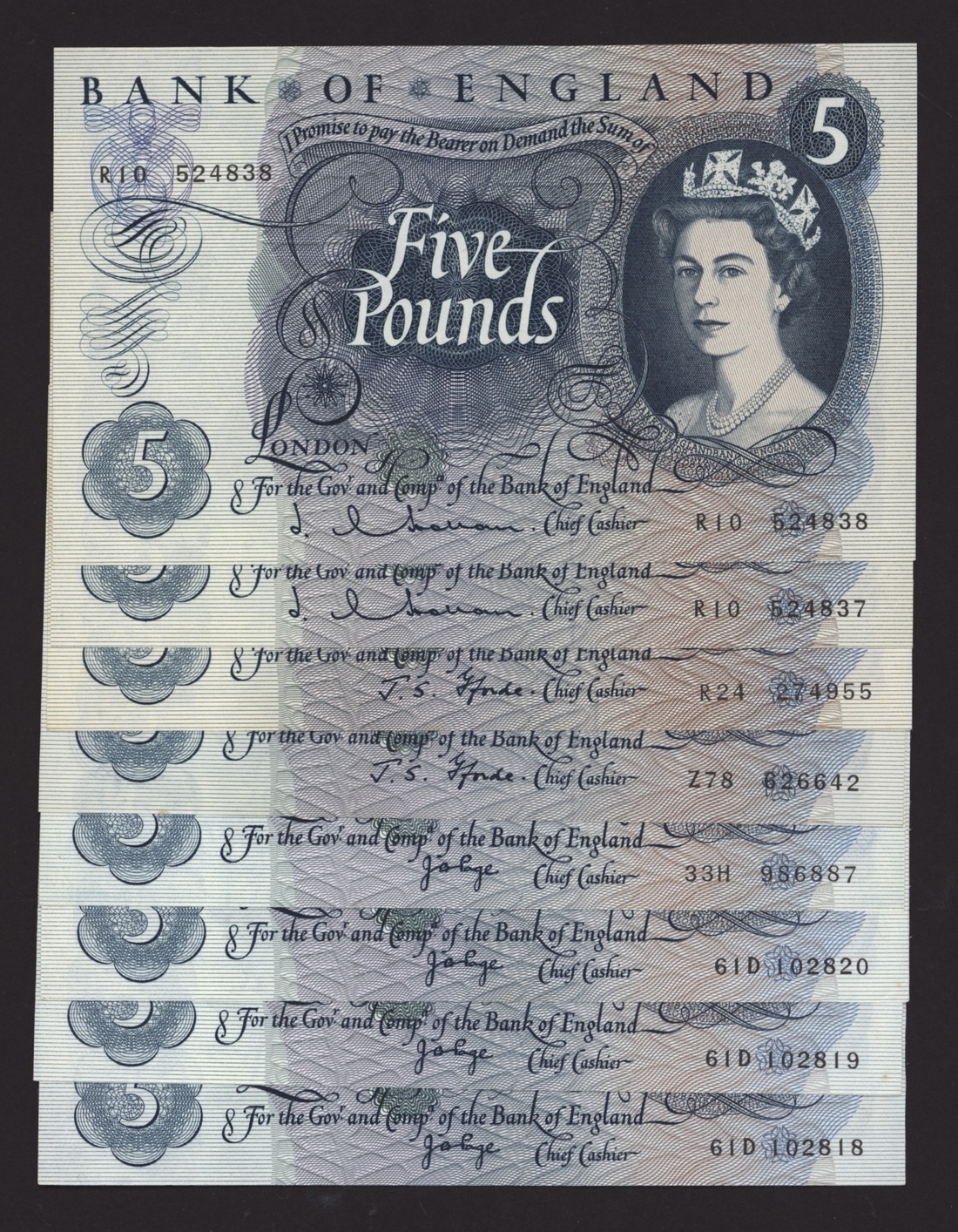Bank of England, [8 notes] £5, 1963-71, including [2 LAST SERIES] Hollom notes, [1 FIRST SERIES] Fforde note, [1 LAST SERIES] Page notes and a run of 3 consecutive serial numbers 33H 102818-20