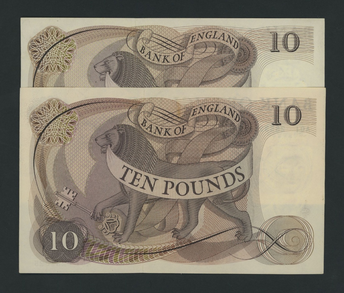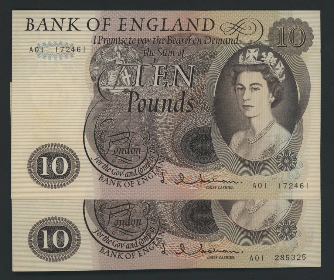 Bank of England, [2 notes] [FIRST RUN] £10, ND (1964-6), Hollom signature, serial numbers A01 172461 and A01 285325