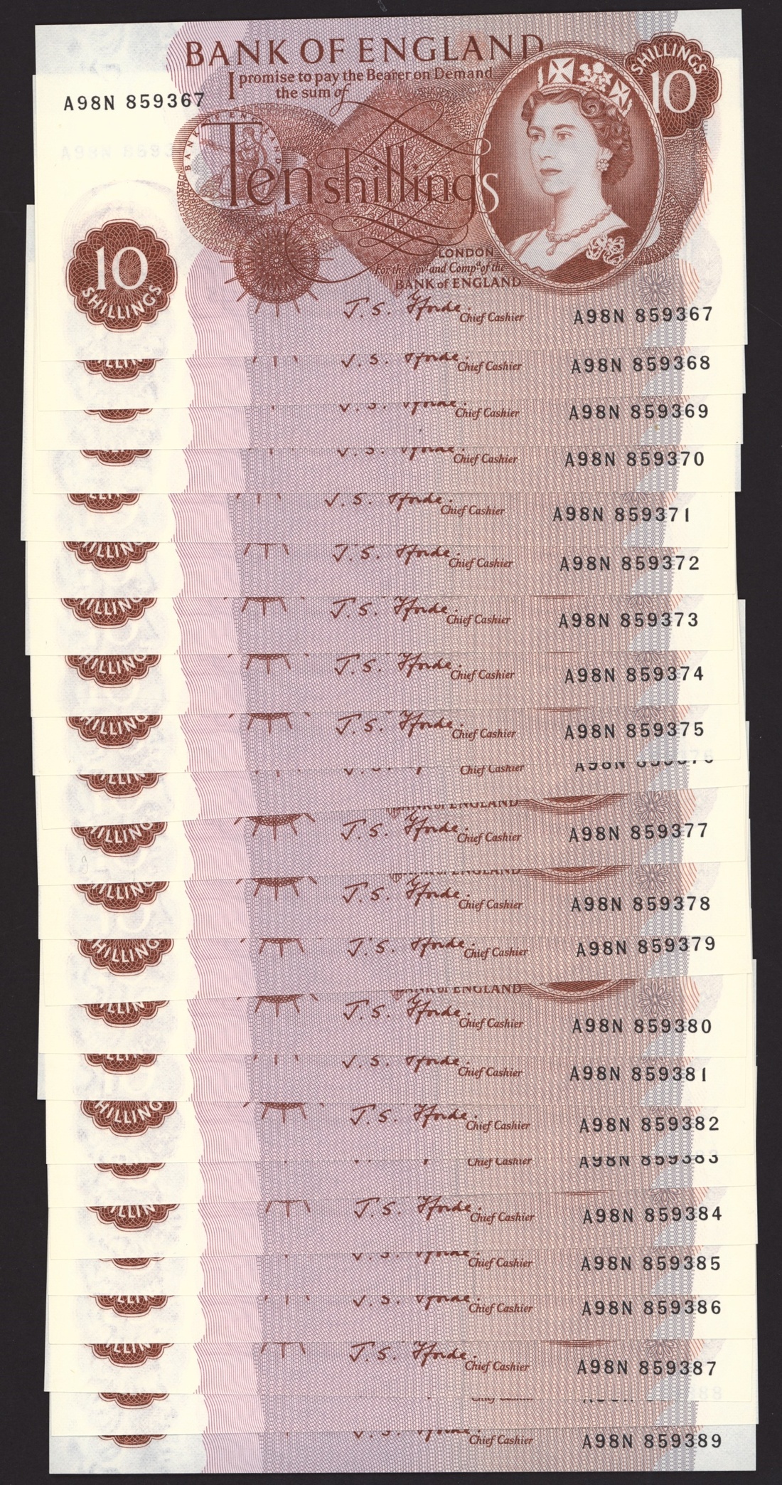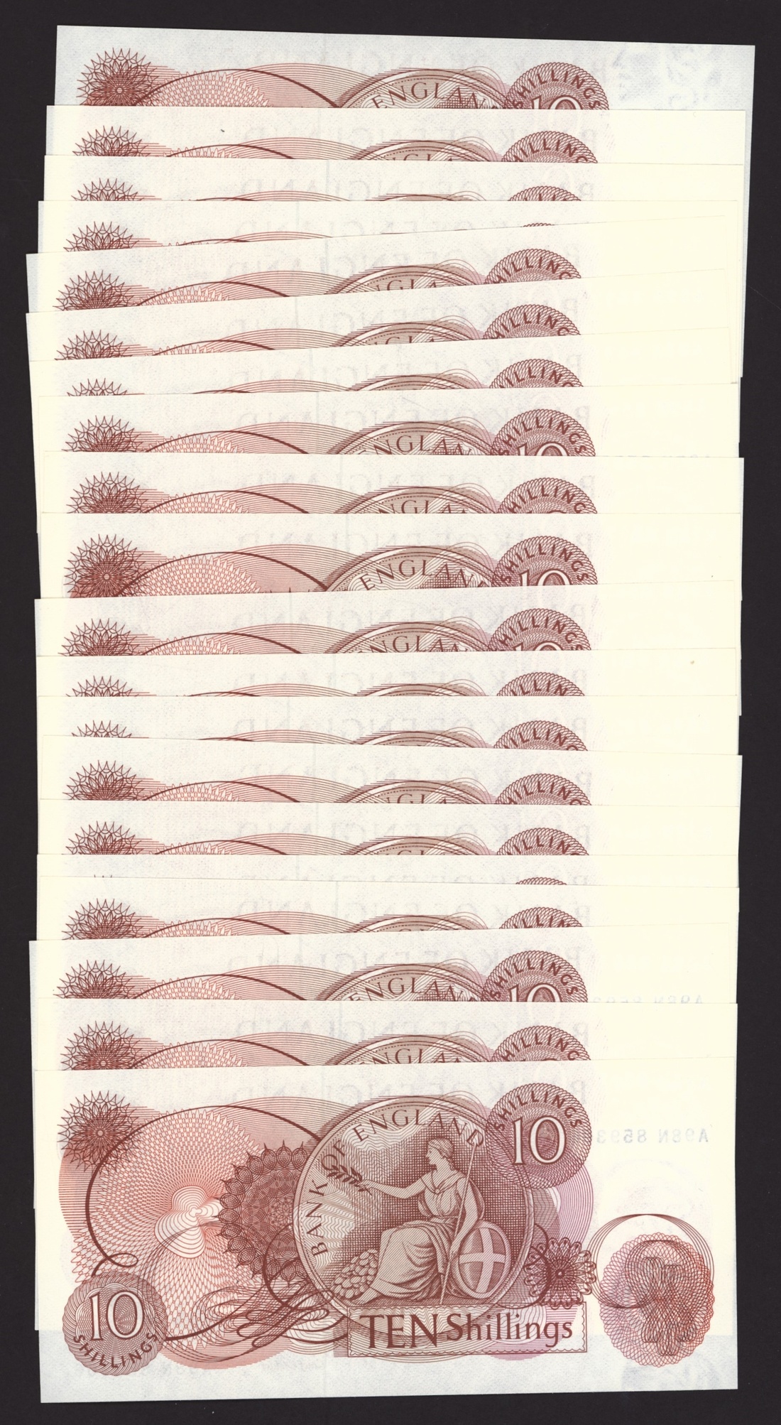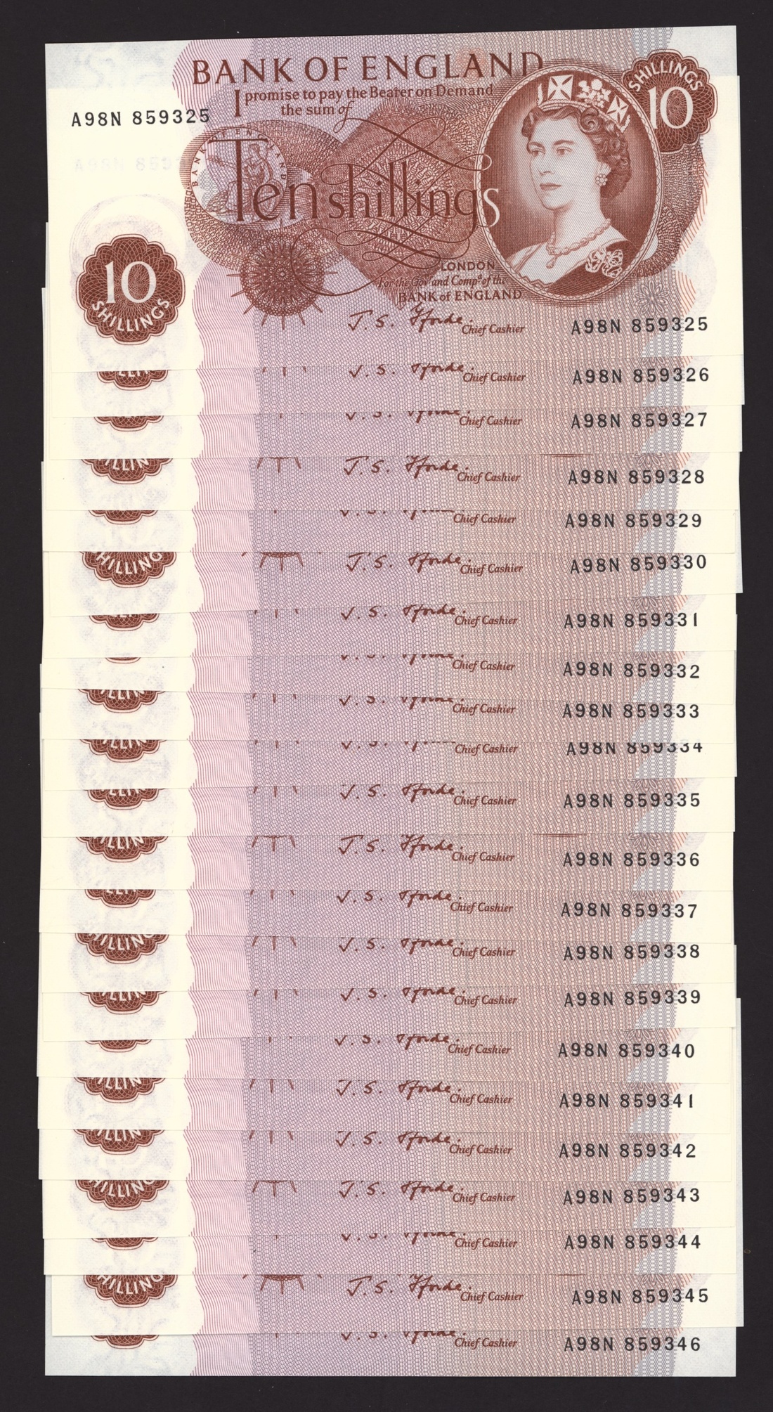 Bank of England, [100 notes] 10 Shillings, ND (1967), consecutive serial numbers A98N 859301-A98N 859400, F.S. Fforde signature, (EPM B310), uncirculated (100 notes)