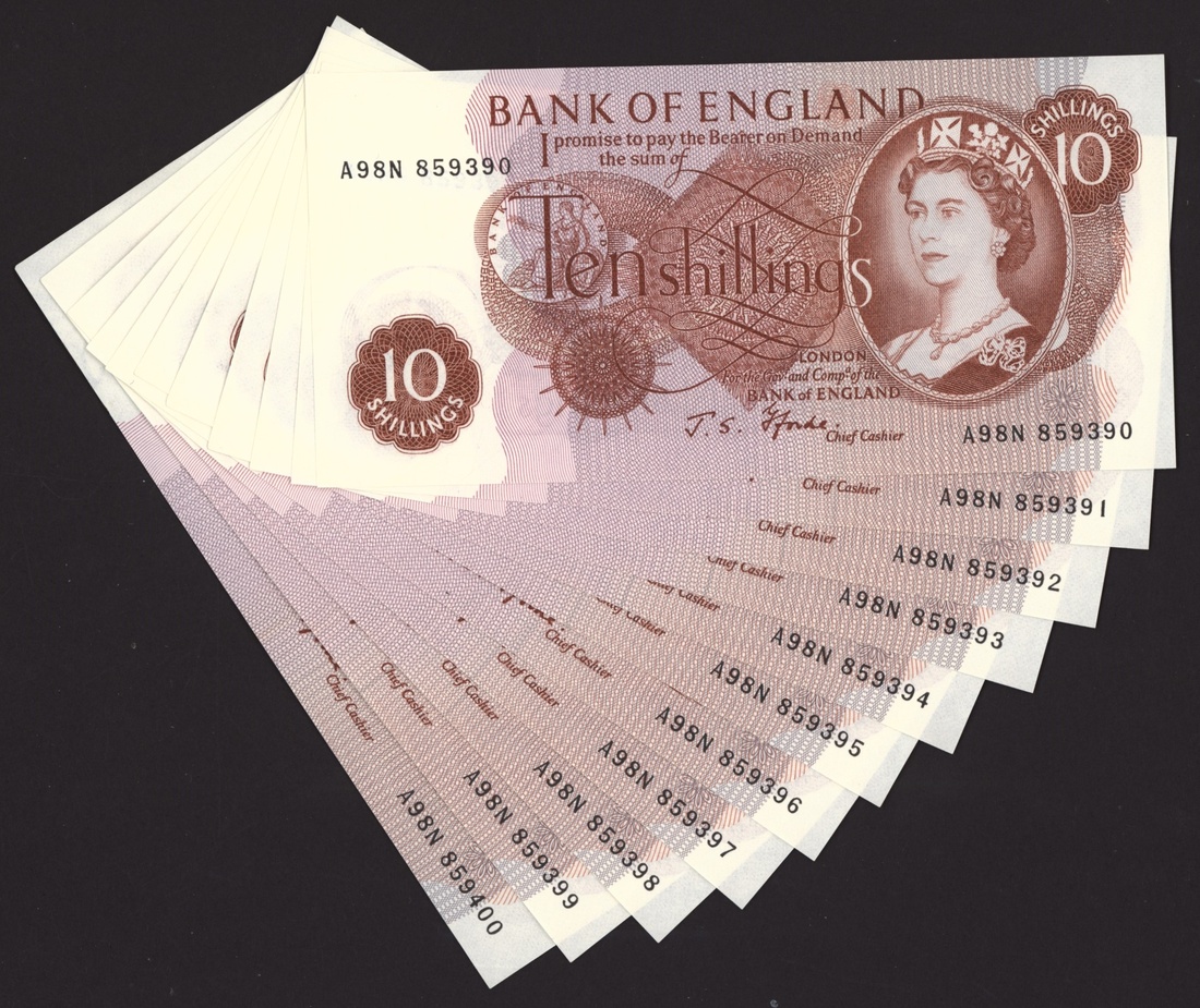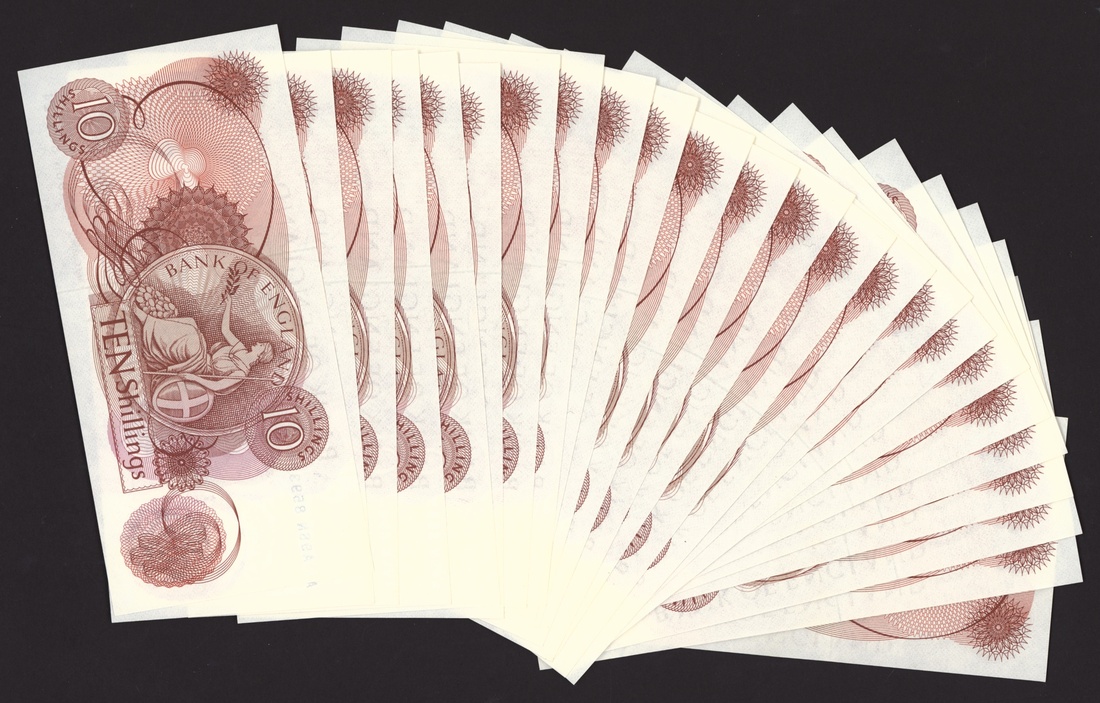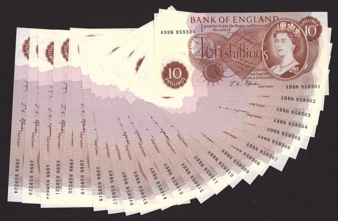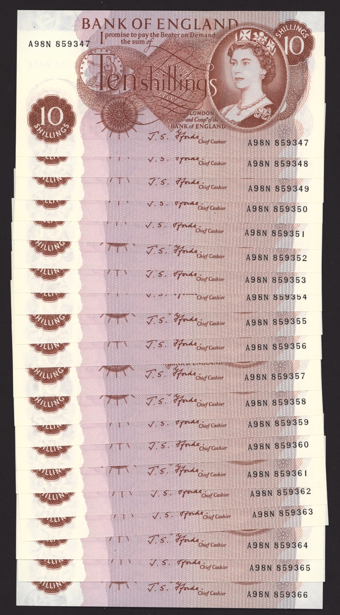 Bank of England, [100 notes] 10 Shillings, ND (1967), consecutive serial numbers A98N 859301-A98N 859400, F.S. Fforde signature, (EPM B310), uncirculated (100 notes)