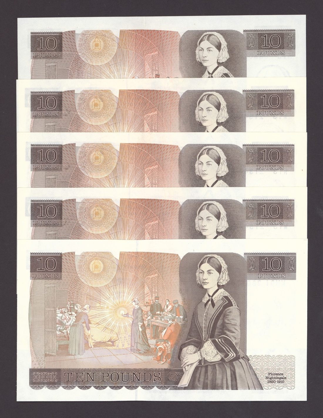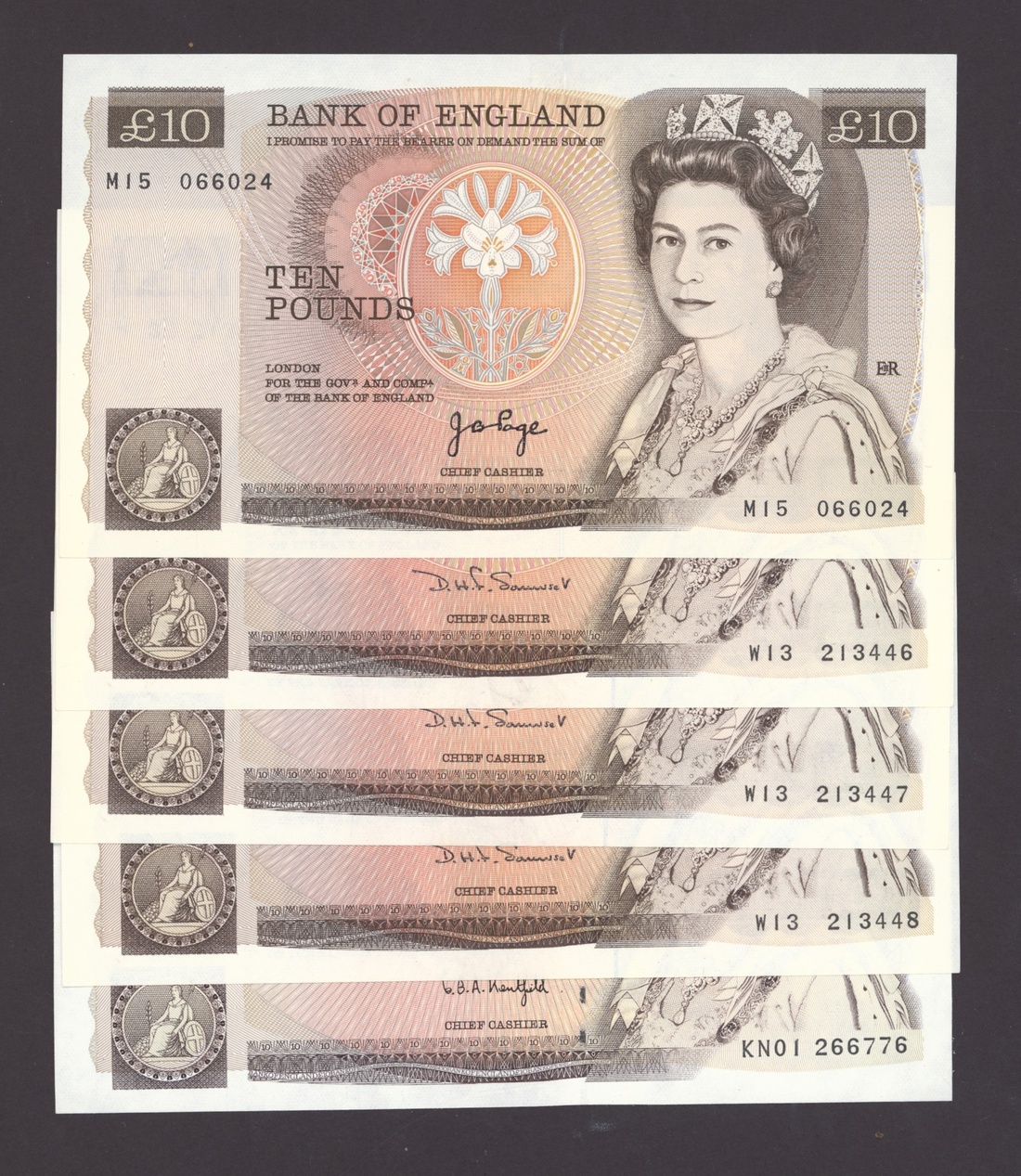 Bank of England, [5 notes] £10, 1975-92, J. B. Page (1), ND (1975-80), serial number M15 066024; D. H. F. Somerset (3) ND (1980-4), consecutive serial numbers W13 213446-8; G. E. A. Kentfield, ND (1991-2), serial number KN01 266776 [FIRST RUN]