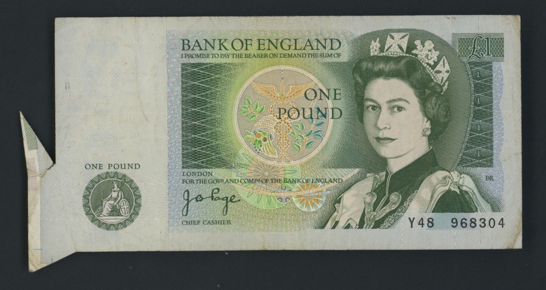 (x) Bank of England, extra paper error £1, London, ND (1978-80), serial number Y48 968304, very fine, discolouration and small tear to the extra paper on left side