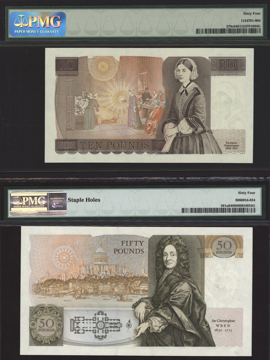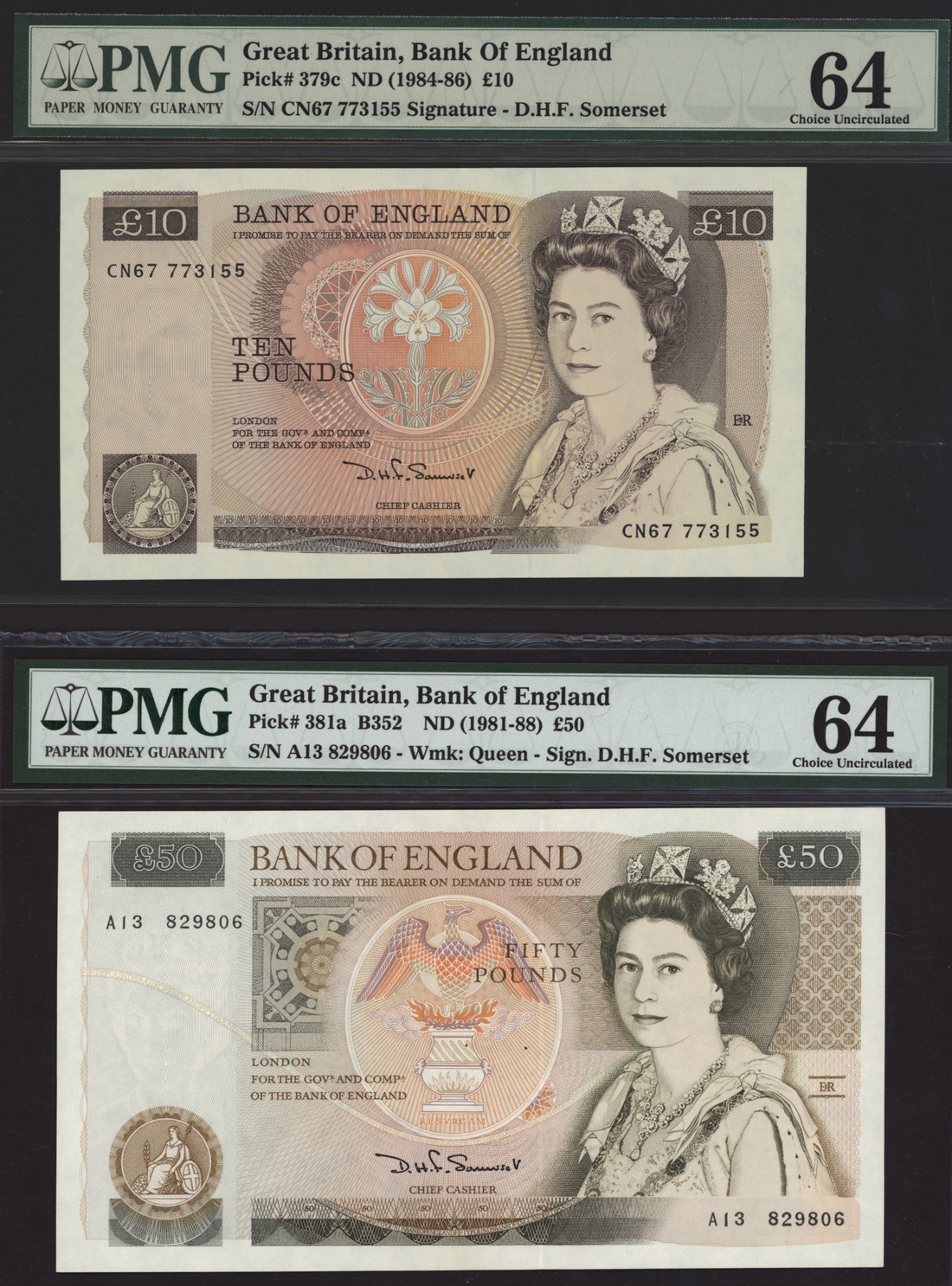 (x) Bank of England, [2 notes] £10, £50, D. H. F. Somerset signature, £10, ND (1984-86), CN 67 773155; £50, ND (1981-88), A13 829806