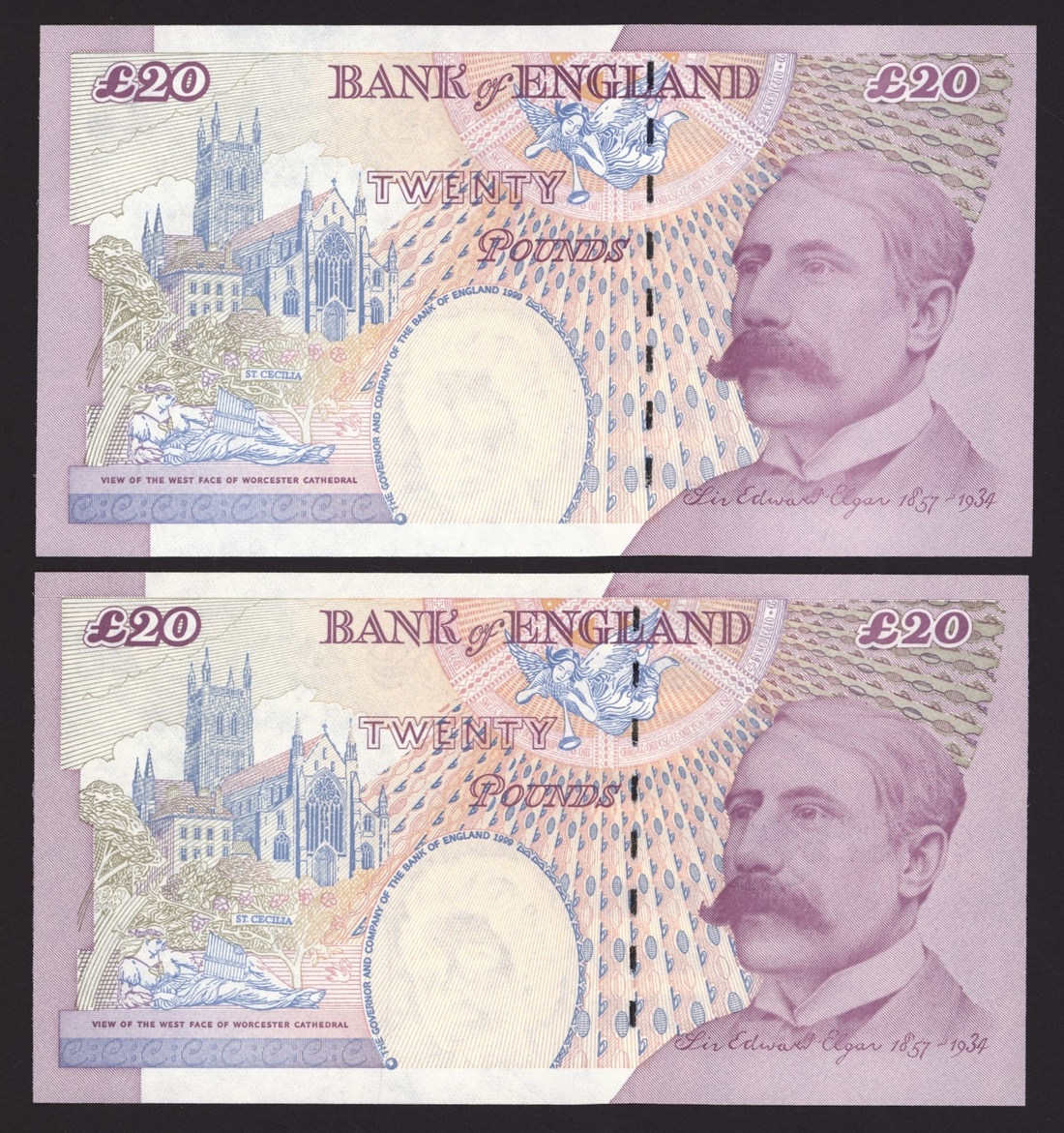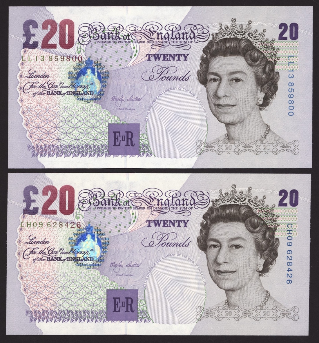 Bank of England, [2 notes] £20, ND (1999), serial numbers LL13 859800 and CH09 628426, M. Lowther signature, (EPM B386, B387), uncirculated (2 notes)