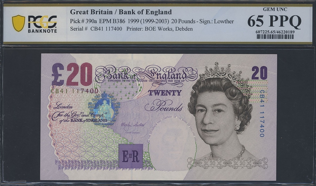 (x) Bank of England, £20, 1999 (1999-2003), serial number CB41 117400, (Pick 390a, BNB 200), in PCGS holder 65 PPQ Gem Uncirculated