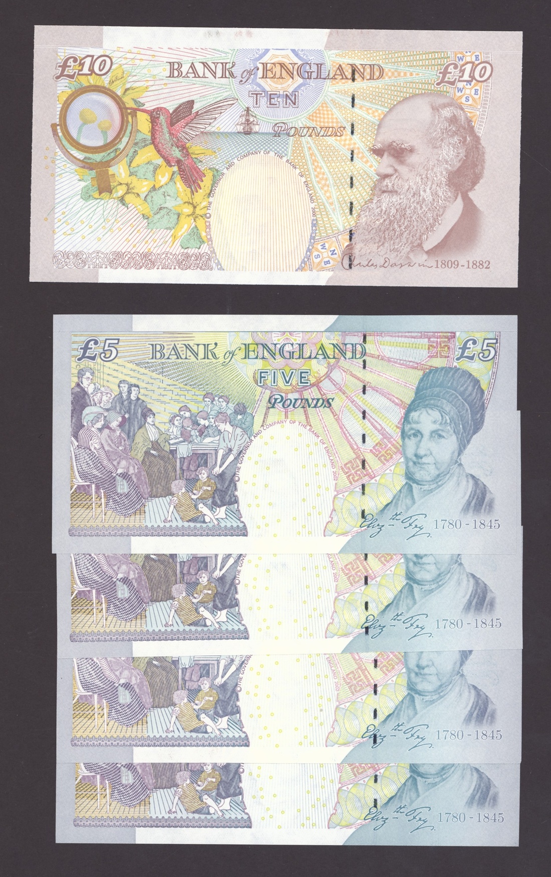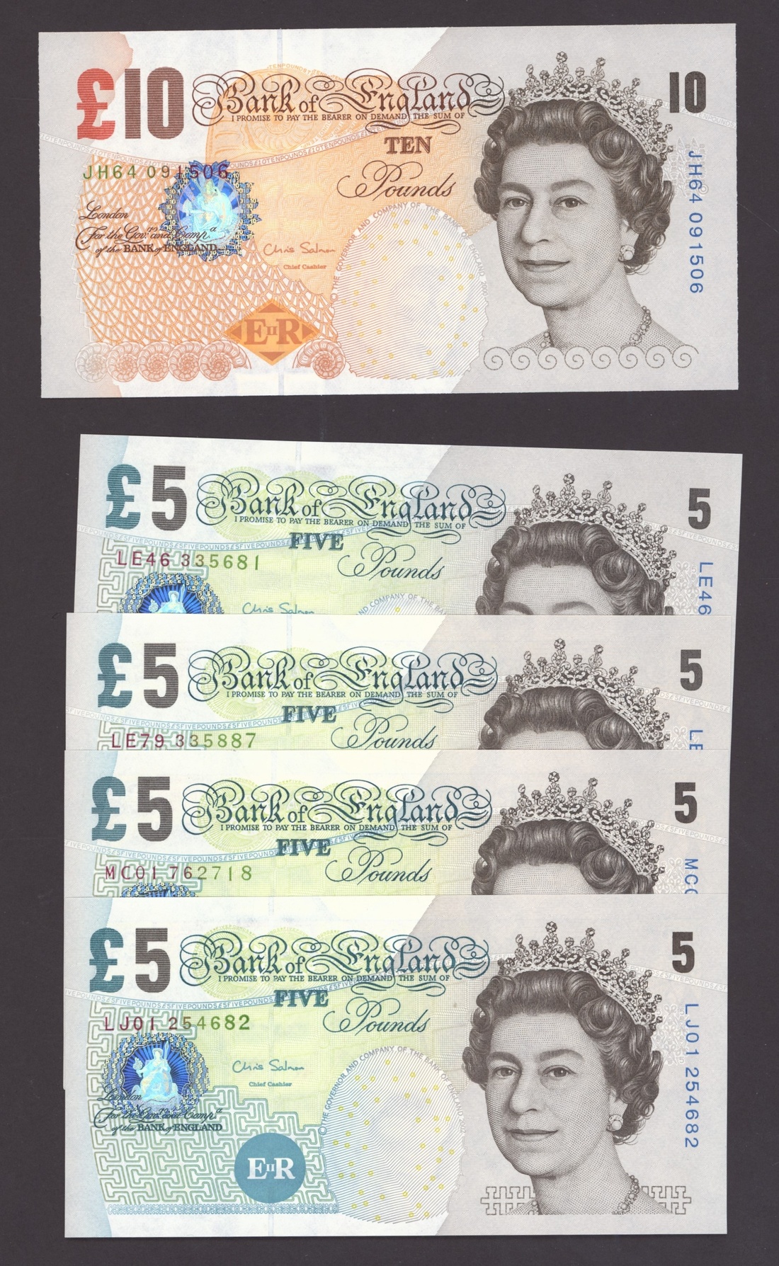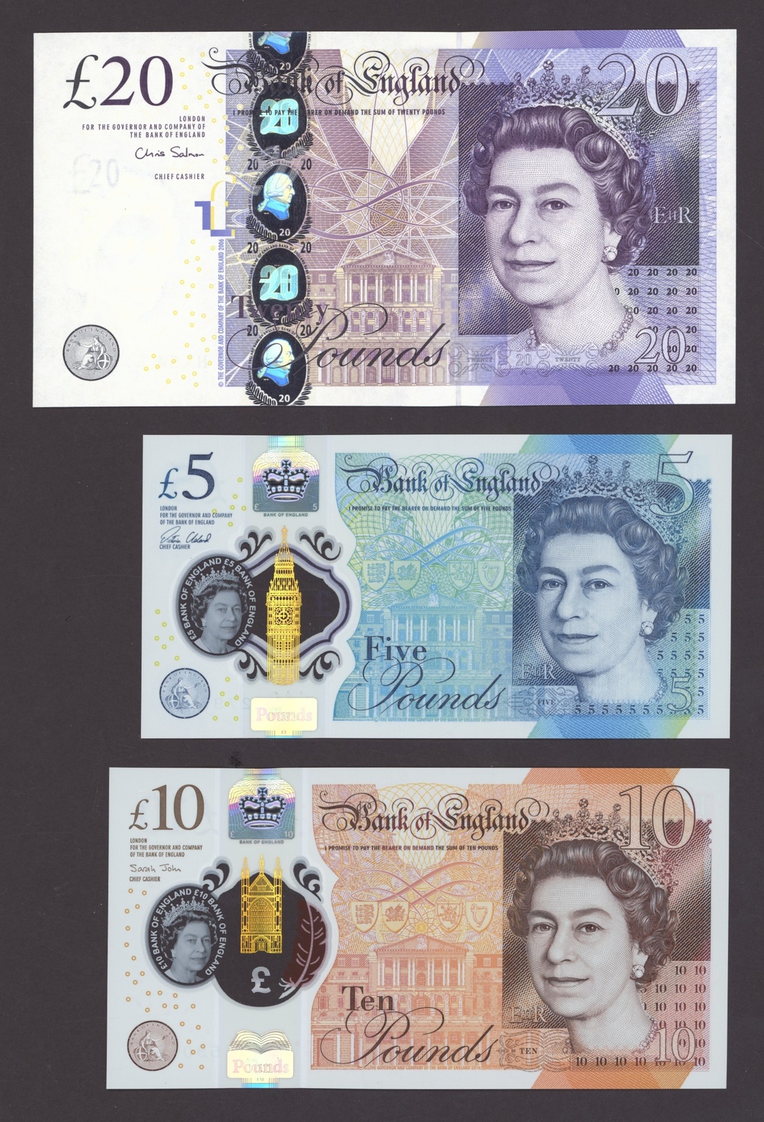 Bank of England, [8 notes] £5, £10, £20, 2012-2020, Salmon signature (6) £5, serial numbers: LE46 335681, LE79 335887, MC01 762718, LJ01 254682; £10, serial number JK64 091506£20, serial number: HA54 577902. Cleland signature (1) £5, AA01 279045. John signature (1) £10, serial number: DM10 590164