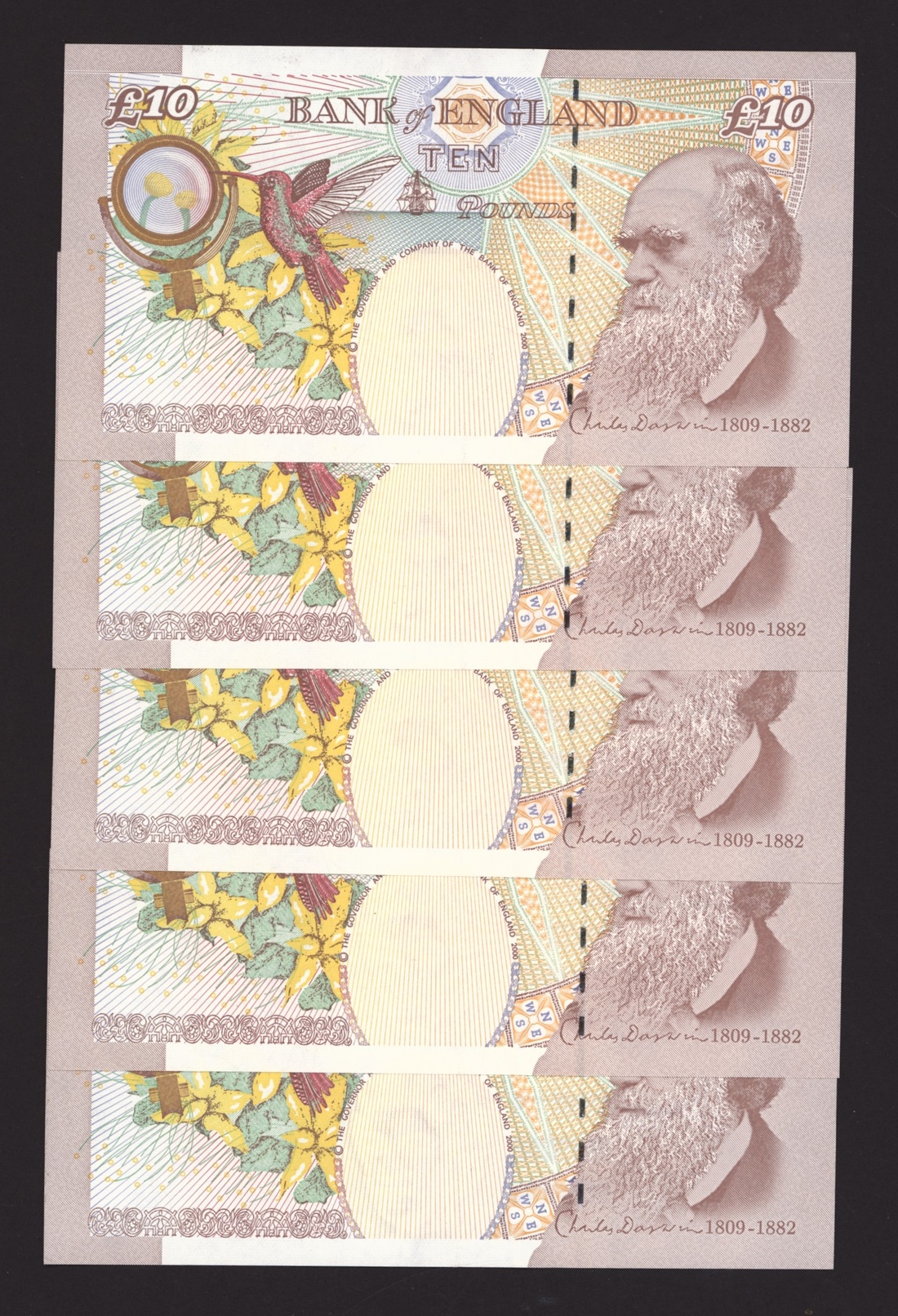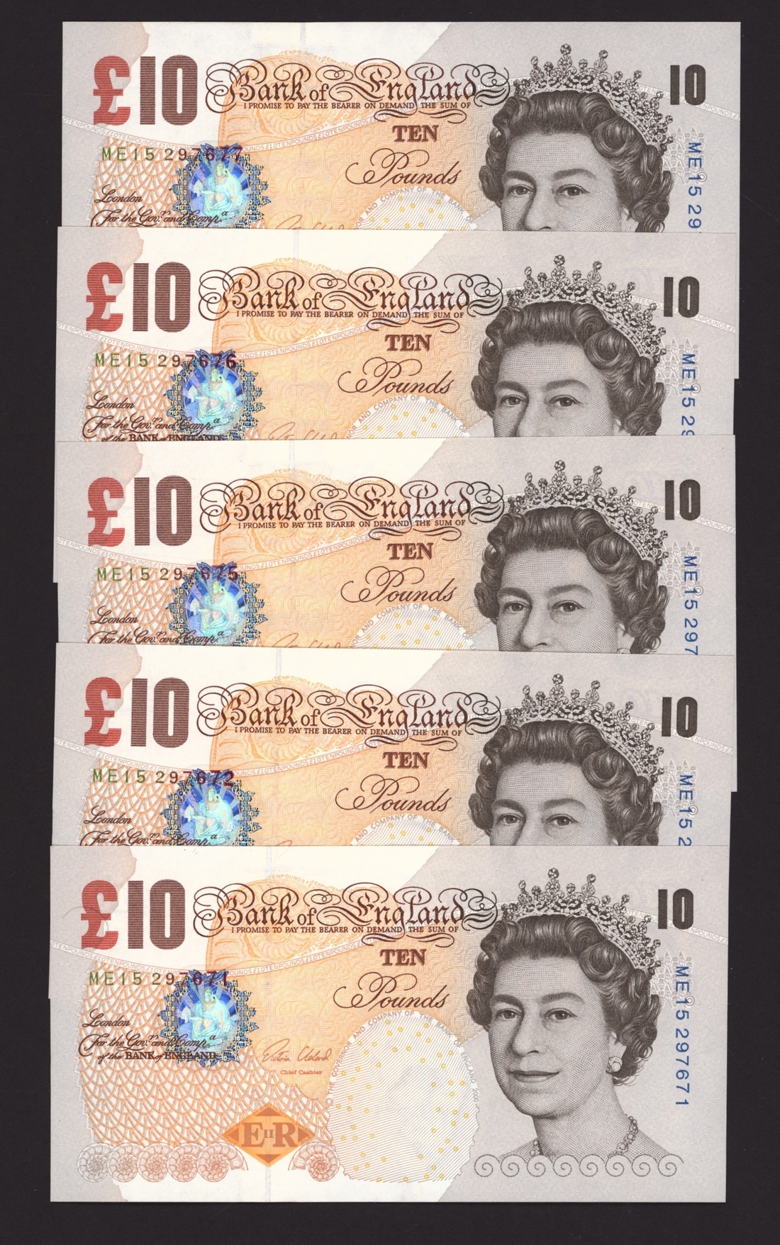 Bank of England, [5 notes] £10, ND (2015), V. Cleland signature, serial numbers ME15 297671-2, and 297675-7