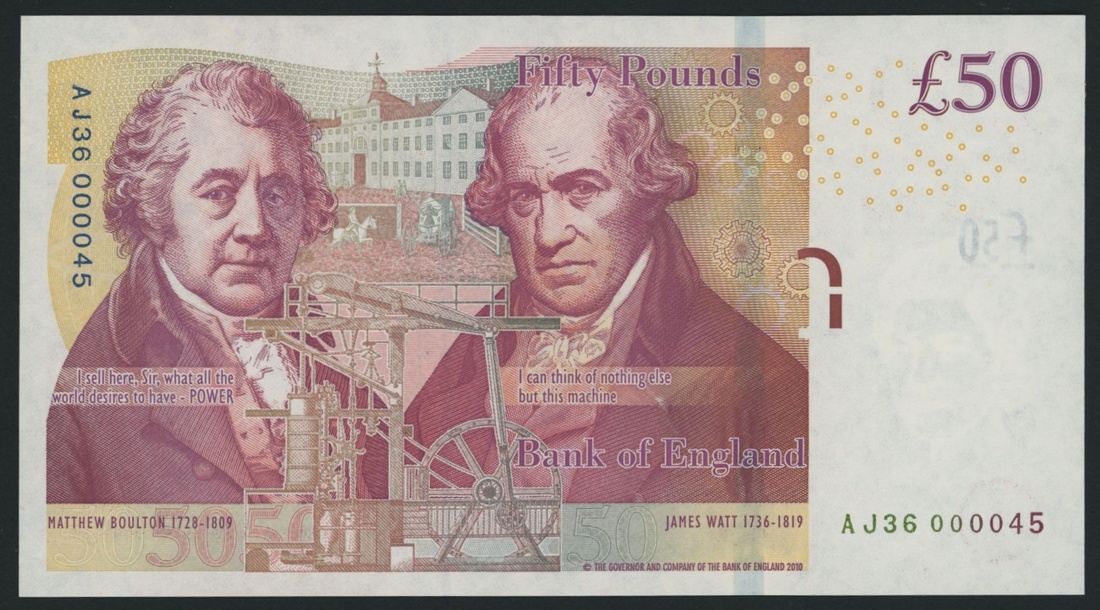 Bank of England, [First Series] £50, 2010 (ND 2015), serial number AJ36 000045, V. Cleland signature, (Pick 393b, EPM B413), uncirculated, low serial number