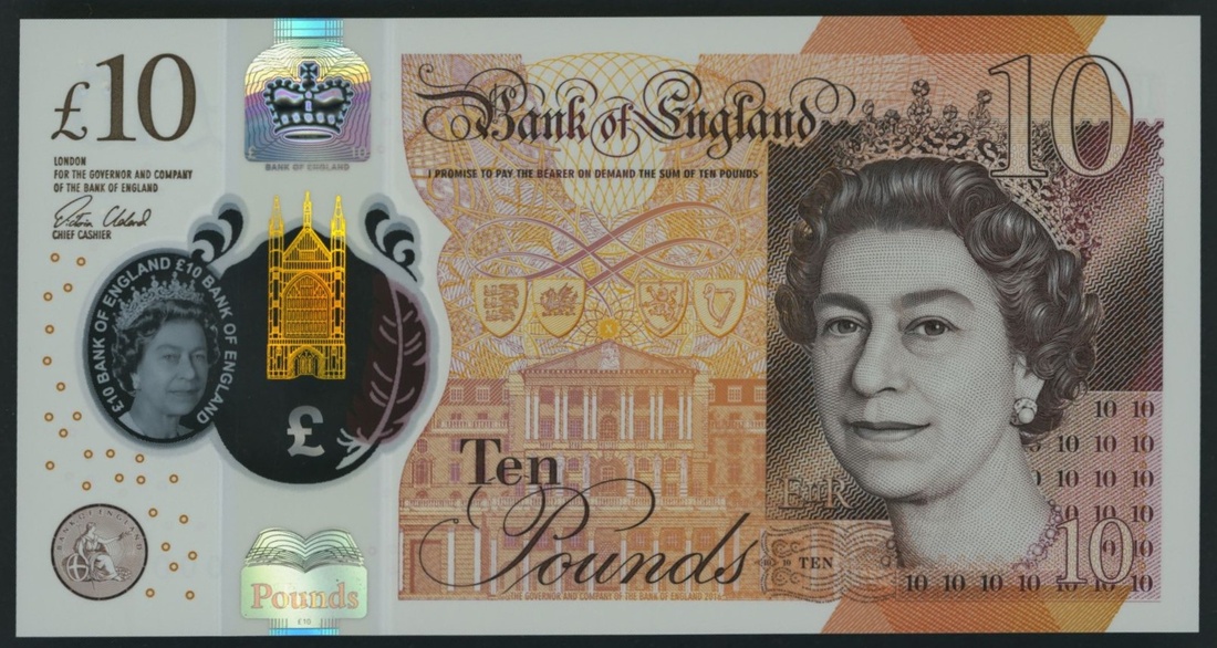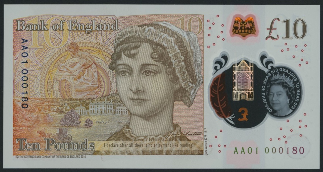 Bank of England, £10 on polymer, ND (14 September 2017), serial number AA01 000180, V. Cleland signature, orange-brown, Queen Elizabeth II at right, transparent window at left with portrait of the Queen and view of Winchester Cathedral, the latter highlighted in gold. To the right of Winchester Cathedral is a quill, which shows as orange or purple depending on angle of view. Reverse orange-brown, a portrait of Jane Austen. To her left is an illustration of Elizabeth Bennet, the central character in 'Pride and Prejudice'. A foil silver image at left depicts Winchester Cathedral