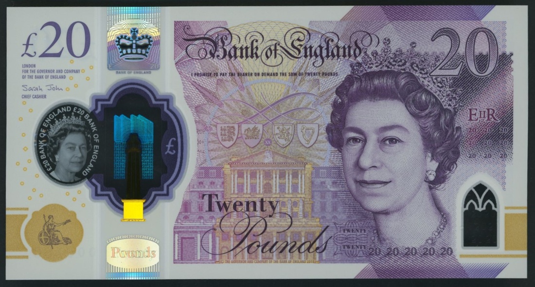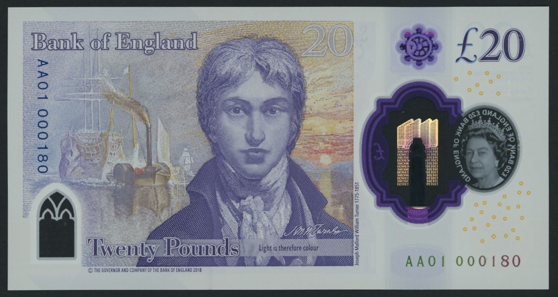 Bank of England, polymer £20, ND (20 February 2020), serial number AA01 000180, S. John signature, purple and multicoloured, Queen Elizabeth II at right and in a transparent window at left with text £20 BANK OF ENGLAND. Margate lighthouse in gold and the Turner Contemporary in blue appear over the window, a second smaller window based on Tintern Abbey low right. Reverse purple, a self portrait of Turner and his painting of The Fighting Temeraire in field, a purple foil patch at upper right with letter T is based on the staircase at the Tate Britain