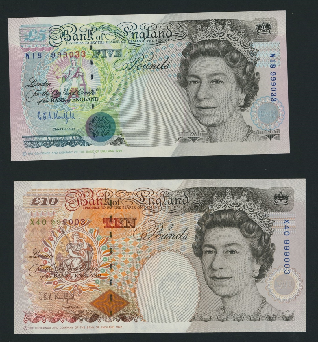 Bank of England, [2 notes] £5, £10, ND (1994), Kentfield signature, £5 serial number W18 999033; £10 serial number X40 999003