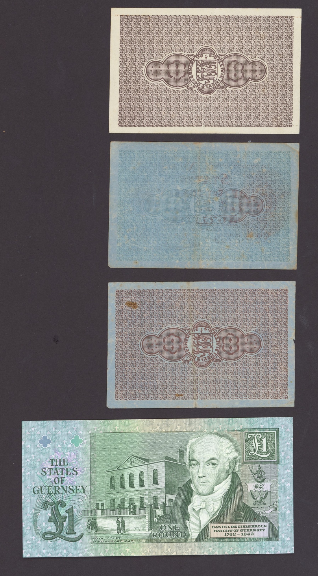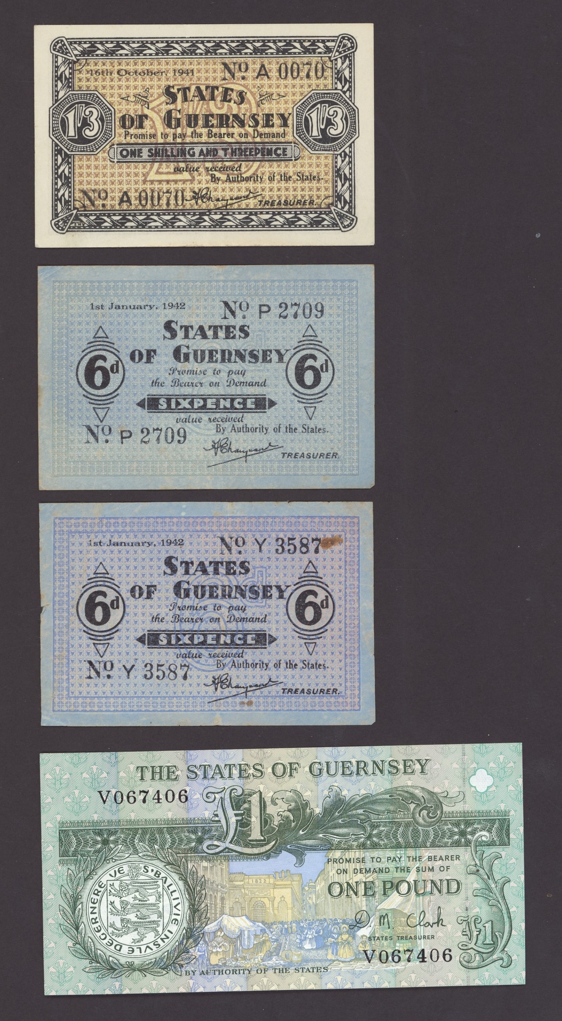 States of Guernsey, [4 notes] 6 Pence, 1 Shilling and 3 Pence, £1, 1941-, 1/- 3d, 16th October 1941, serial number A0070; 6d, 1st January 1942 (2), serial numbers P2709 and Y3587; £1, ND (1991), serial number V067406