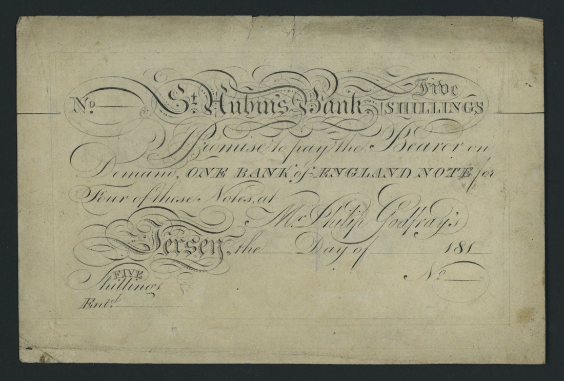 St. Aubin's Bank, Jersey, proof 5 shillings, 181-, no previous record of this note to our knowledge