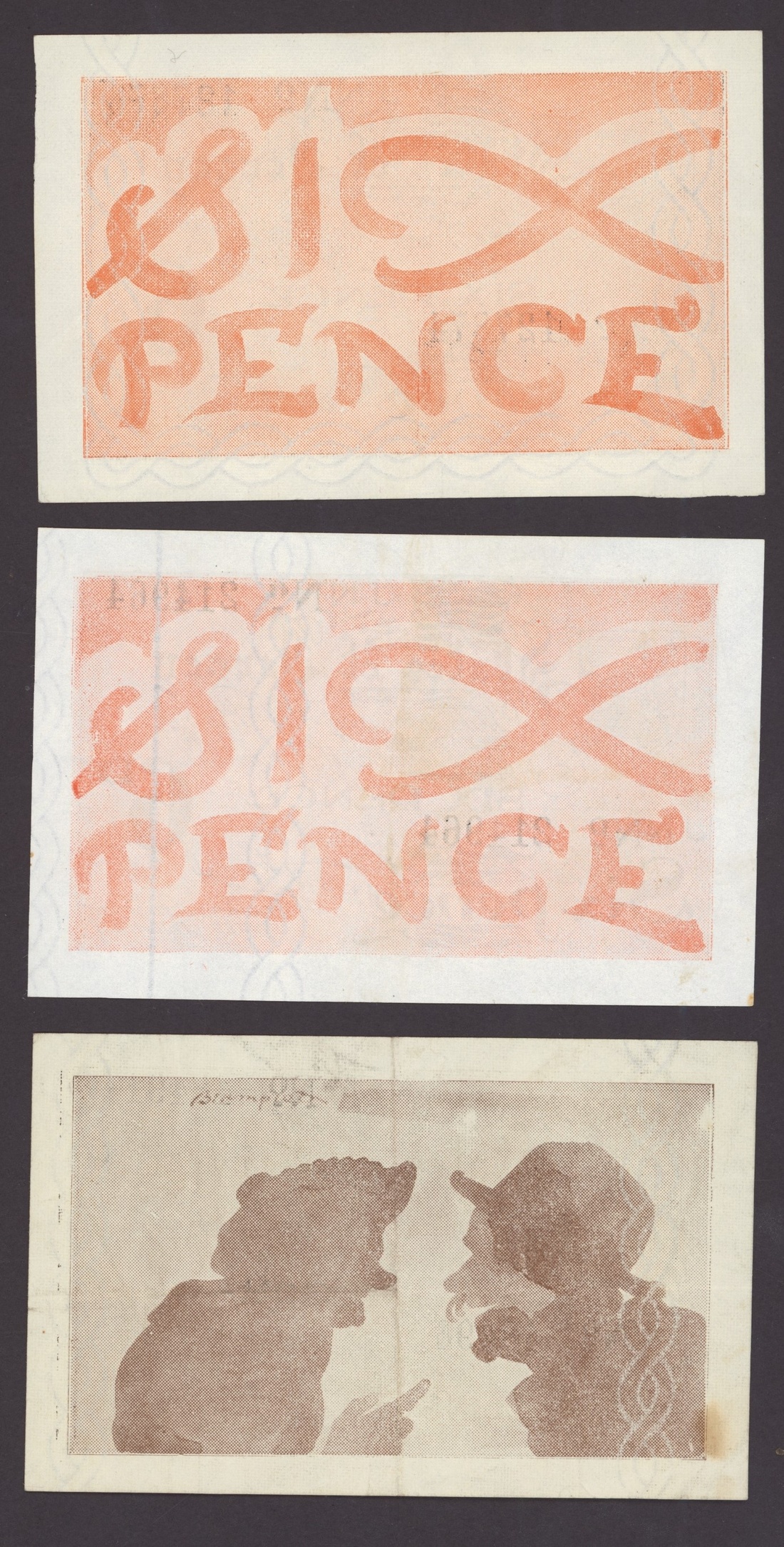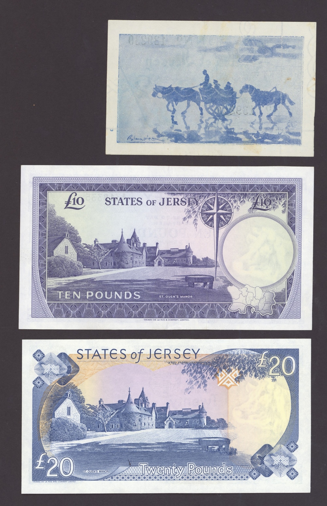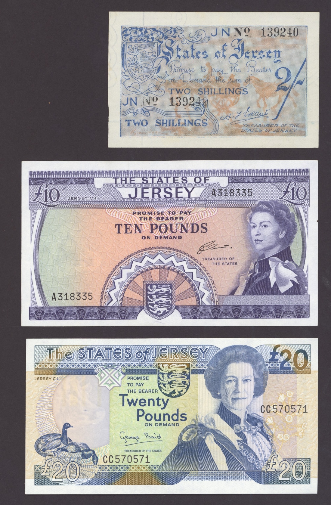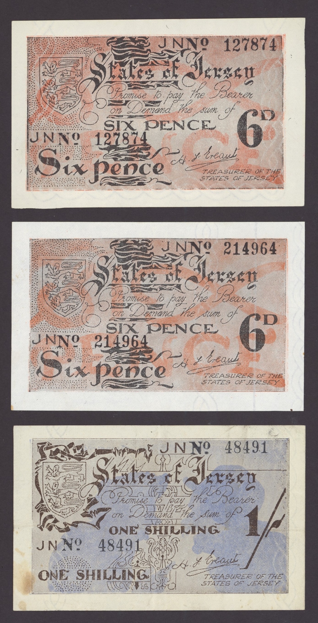 States of Jersey, [6 notes] 1, 2 Shillings, 6 Pence, £10, £20, 1942-89, 6d (2), ND (1942), serial numbers JN 127874 and 214964; 1/-, ND (1942), serial number JN 48491; 2/-, ND (1942), serial number JN 139240; £10, ND (1971), serial number A319335; £20, ND (1989), serial number CC570571