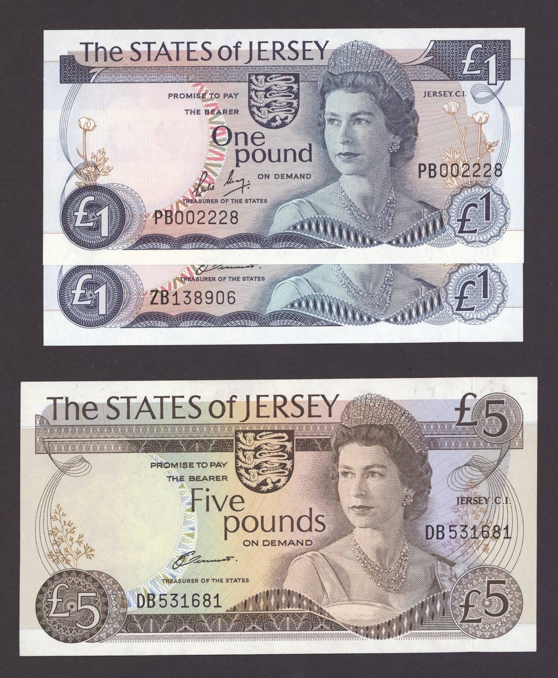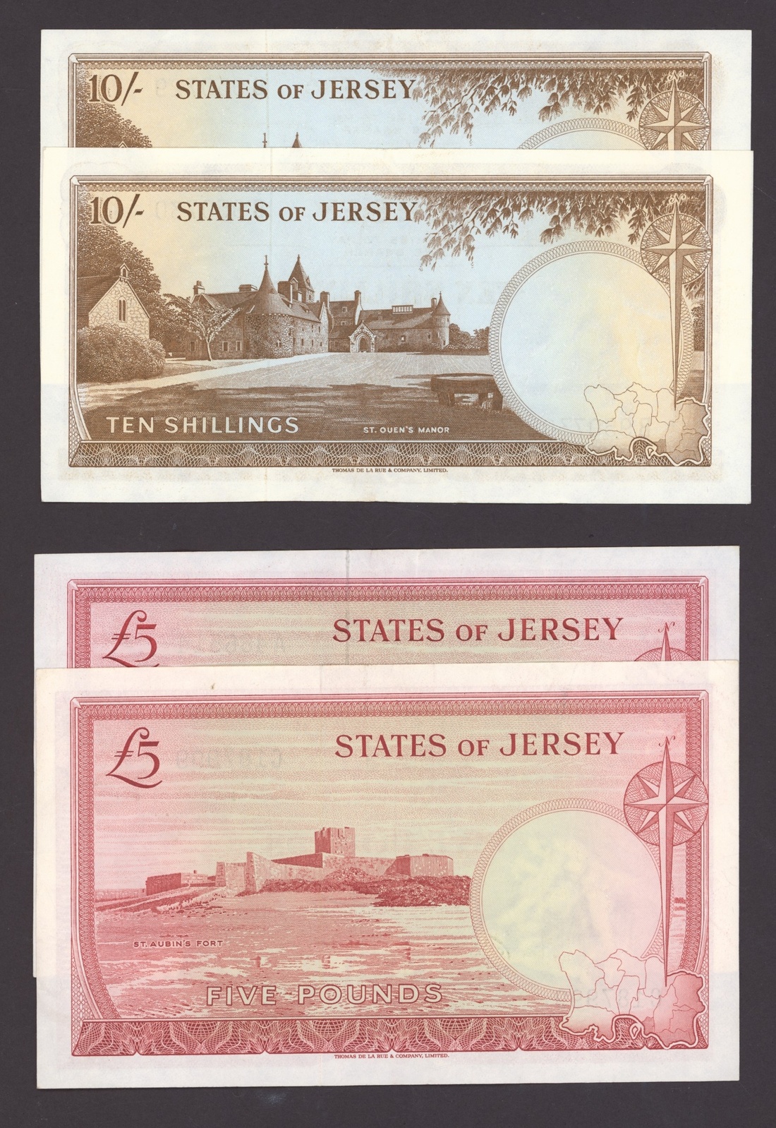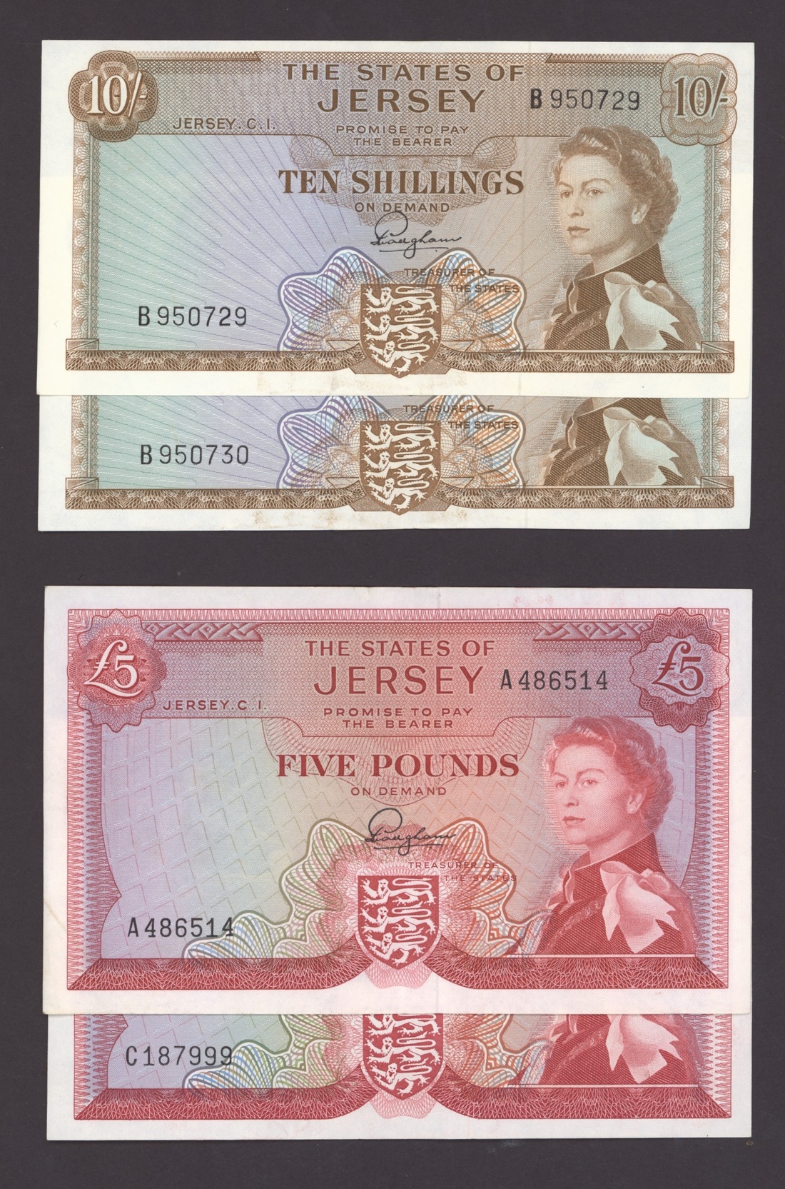 States of Jersey, [10 notes] 10 Shillings, £1, £5, £20, 1963-2004, includes two consecutive serial number 10/- notes, serial number B950729-30