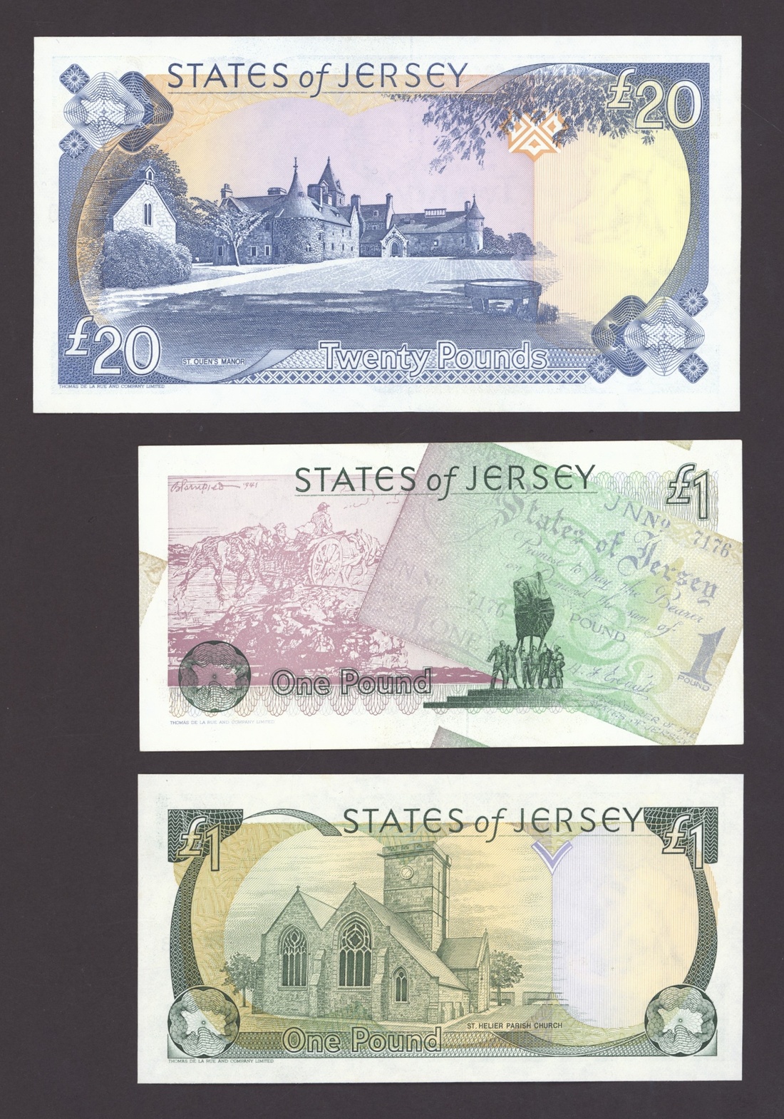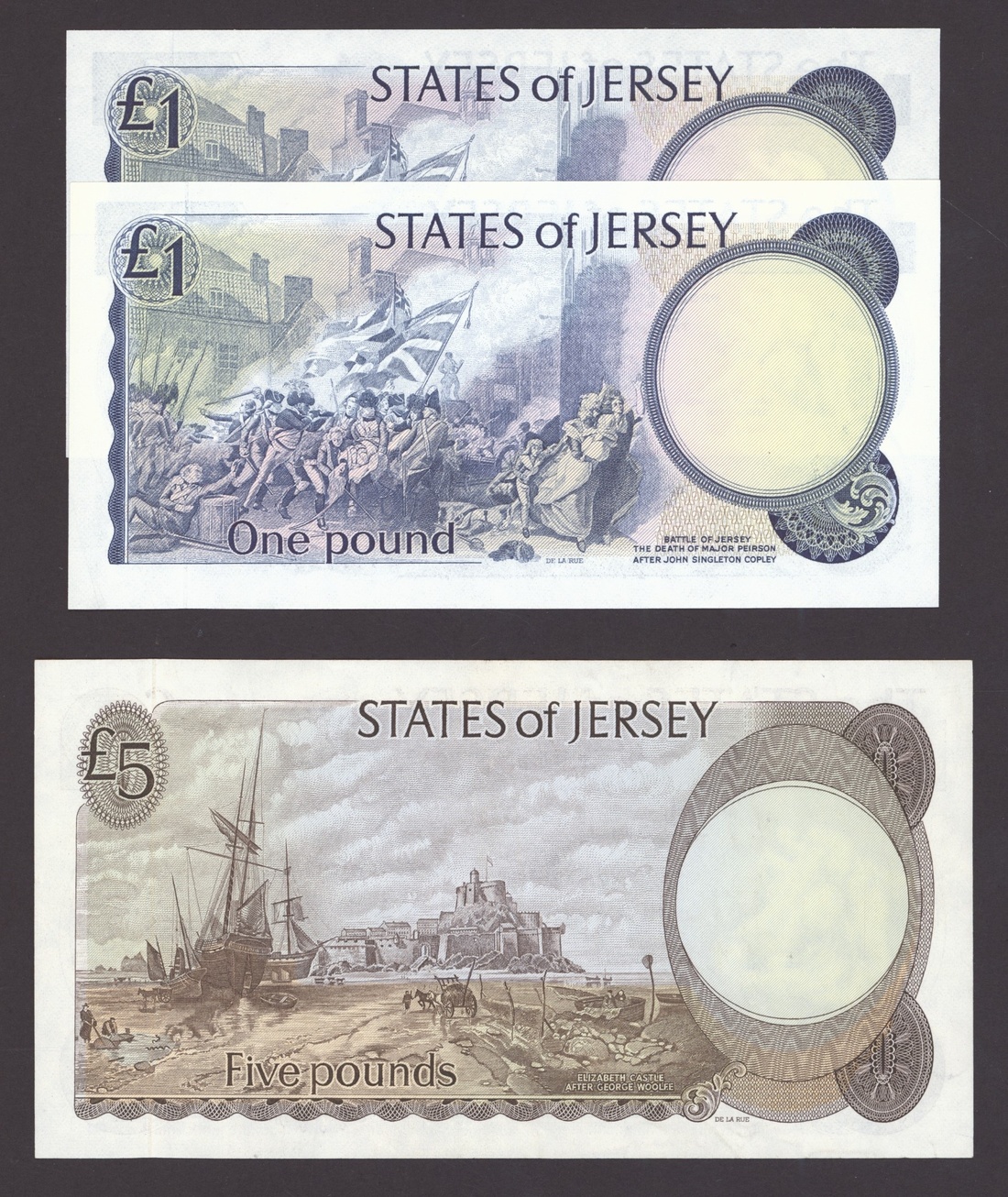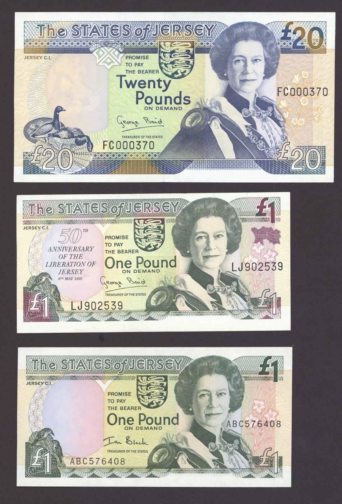 States of Jersey, [10 notes] 10 Shillings, £1, £5, £20, 1963-2004, includes two consecutive serial number 10/- notes, serial number B950729-30